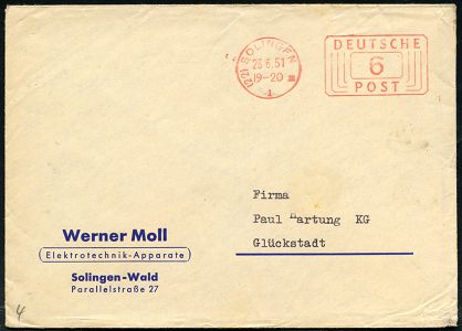 10443 | 10 € | 5650 SOLINGEN (Post- und Absender-Freistempel) : (22) SOLINGEN/ 1/ III/ DEUTSCHE/ POST 1951 (23.6.) PFS Querrechteck 6 (Pf.) mit PLGZ , Firmen-Bf.: Werne Moll, Elektrotechnik-Apparate.. (Dü.D-10, Nr.253) | ![]() | |