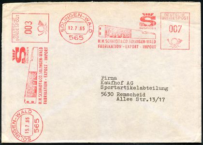 10452 | 16 € | 5650 SOLINGEN (Post- und Absender-Freistempel) : 565 SOLINGEN-WALD/ S/ H.H.SCHMIDT & CO../ FABRIKATION-EXPORT-IMPORT 1965 (12.7.) AFS Francotyp 007 Pf. + 003 Pf. = 2 Abdrucke! (Firmengebäude) = Sportartiel-Hersteller, Fern-Bf. (Dü.E-23CO) | ![]() | |