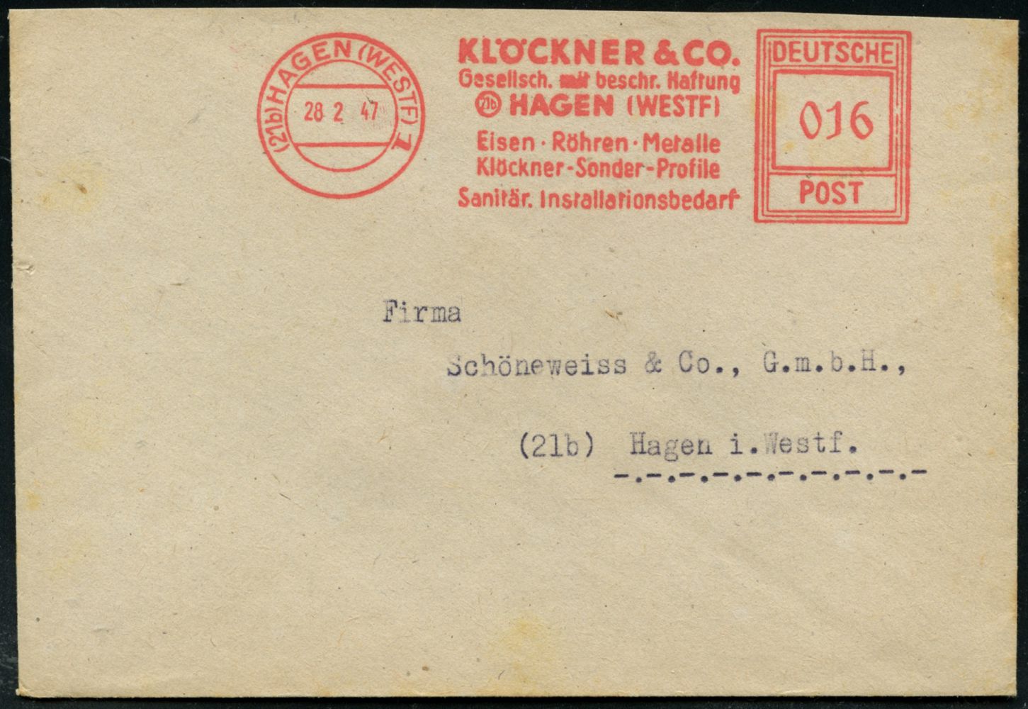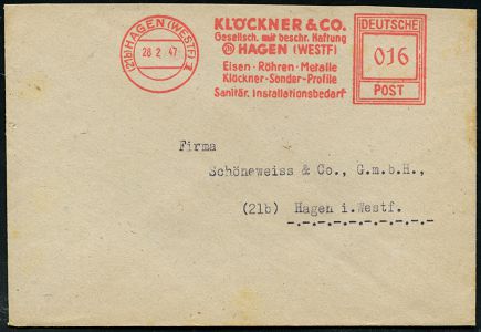 10729 | 18 € | 5800 HAGEN : (21b) HAGEN (WESTF) 2/ KLÖCKNER & CO../ Eisen-Röhren-Metalle/ Klöckner-Sonder-Profile/ Sanitär.Installationsbedarf 1947 (28.2.) seltener AFS Francotyp "Hochrechteck" (Bf. fehlt rs. Klappe) klar gest. Orts-Bf. (Dü.E-18CEo, nur ca. 1 1/2 Jahre verwendet) | ![]() | |