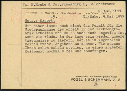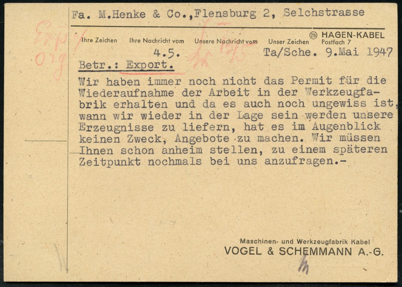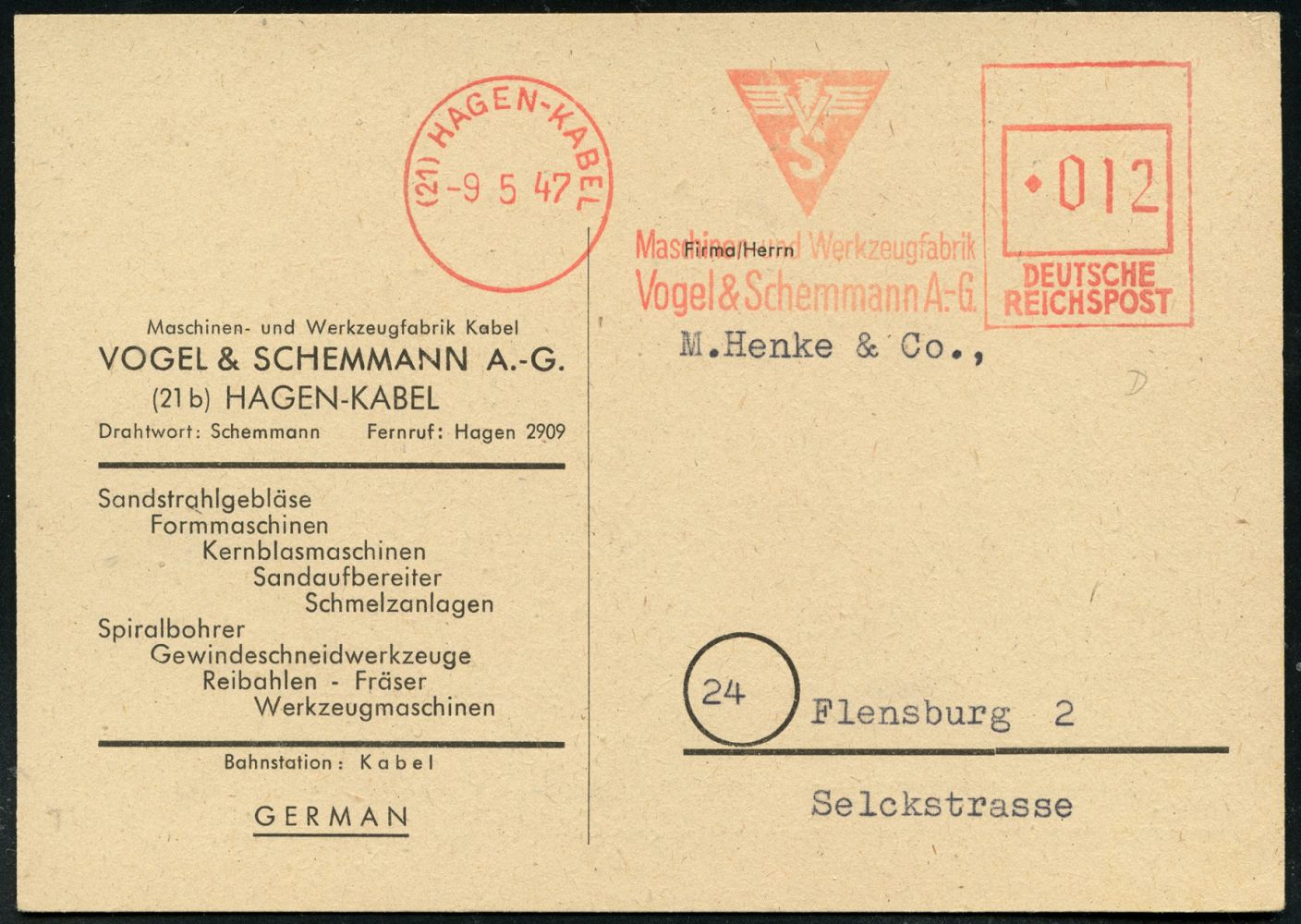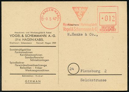 10730 | 30 € | 5800 HAGEN : (21) HAGEN-KABEL/ Maschinen-u.Werkzeugfabrik/ Vogel & Schemmann AG 1947 (9.5.) aptierter AFS Francotyp "Reichsadler" mit Antiqua-Inschrift, "Reichsadler" = entfernt = Notmaßnahme! (Monogr.-Logo) Firmen-Fern-Kt., rs. über Fehlen von (alliierter) Produktion-Erlaubnis (Permit) n. Flensburg (Dü.E-14 C-231o) | ![]() ![]() | |