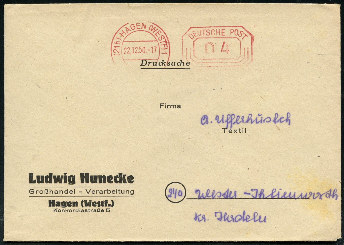 10733 | 10 € | 5800 HAGEN : (21b) HAGEN (WESTF) 1/ DEUTSCHE POST 1950 (22.12.) PFS "Achteck" 04 (Pf.) auf Firmen-Bf.: Ludwig Hunecke, Großhandel.. (Dü.D-11, Nr.260) | ![]() | |