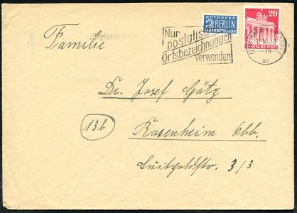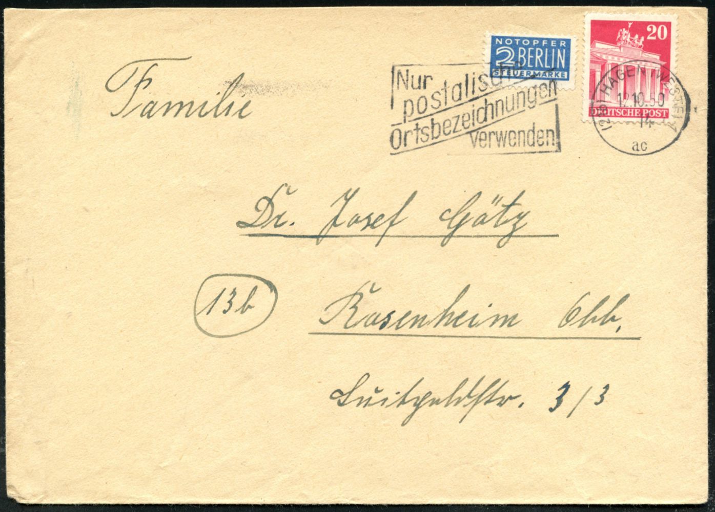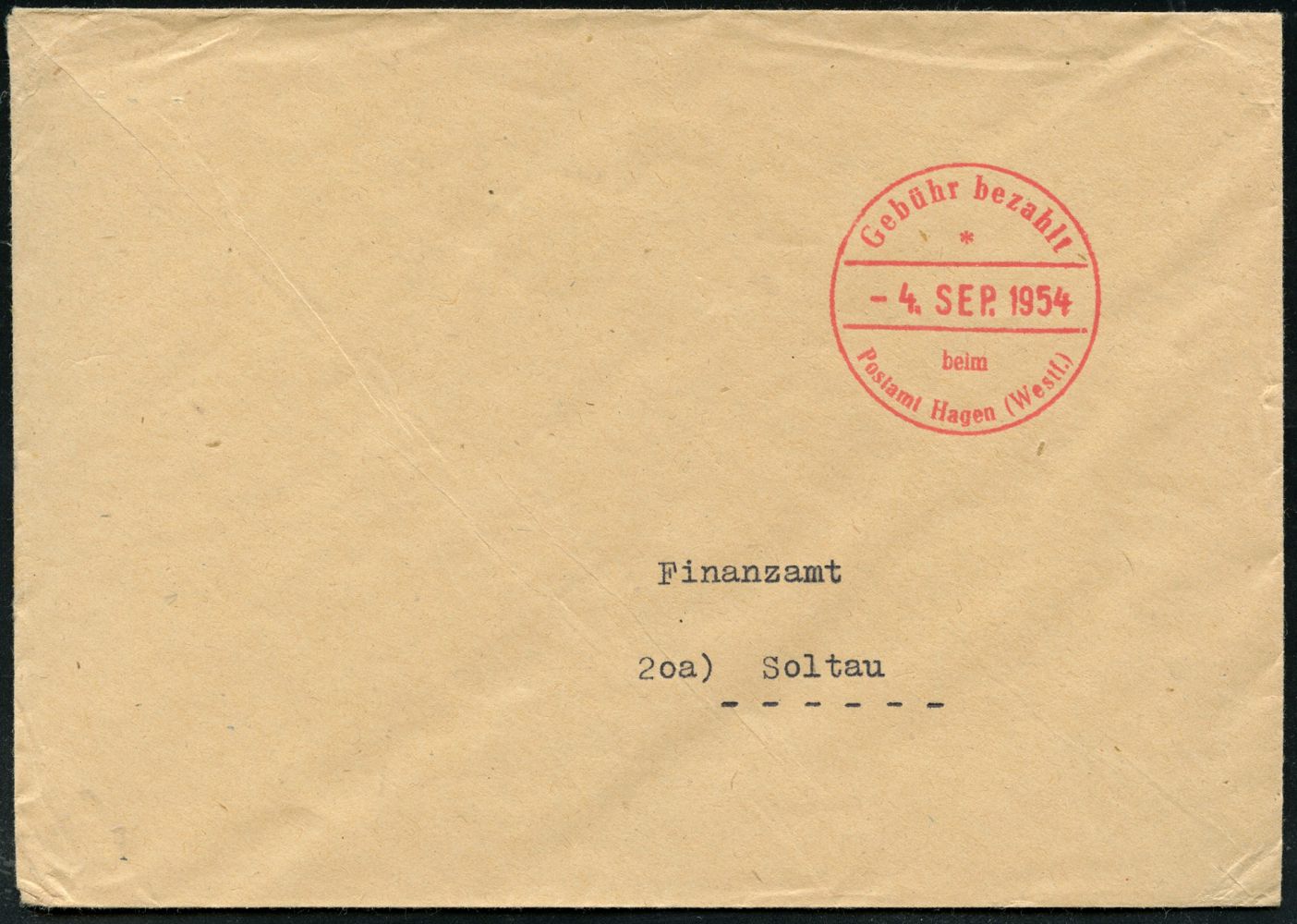 10663 | 16 € | 5800 HAGEN : (21b) HAGEN (WESTF) 1/ ac/ Nur/ postalische/ Ortsbezeichnungen/ verwenden 1950 (12.10.) Serien-MWSt auf 20 Pf. Bauten + 2 Pf. NoN , klar gest. Bedarfs-Bf. (Bo.S 556 A , Erstjahr!) | ![]() | |