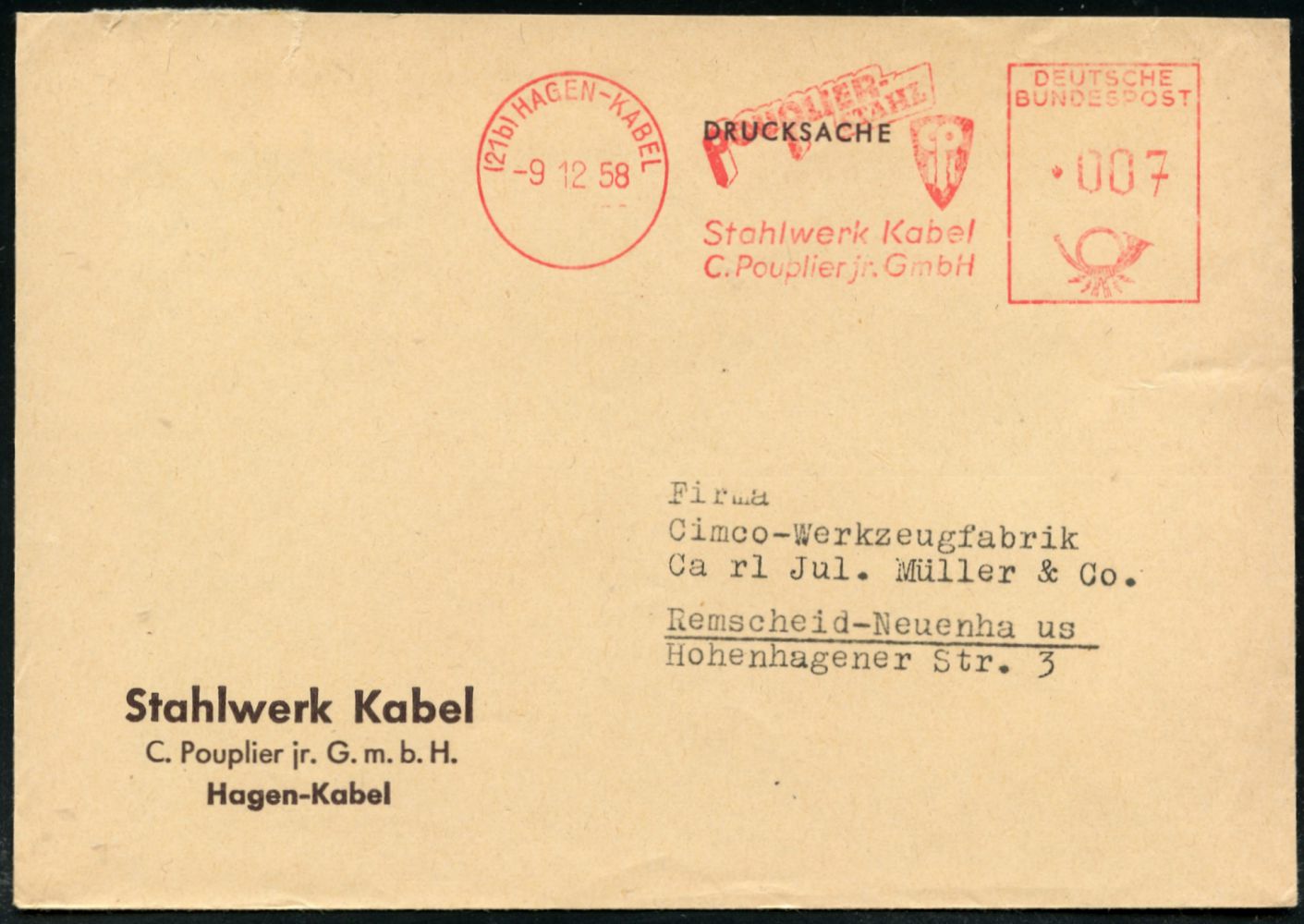 10736 | 15 € | 5800 HAGEN : (21b) HAGEN-KABEL/ POUPLIER/ STAHL/ Stahlwerk Kabel/ C,Pouplier jr. GmbH 1958 (9.12.) AFS Francotyp "Posthorn" (Firmen-Logo) Firmen-Bf.: Stahlwerk Kabel.. (Dü.E-23DGo) | ![]() | |