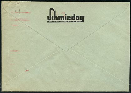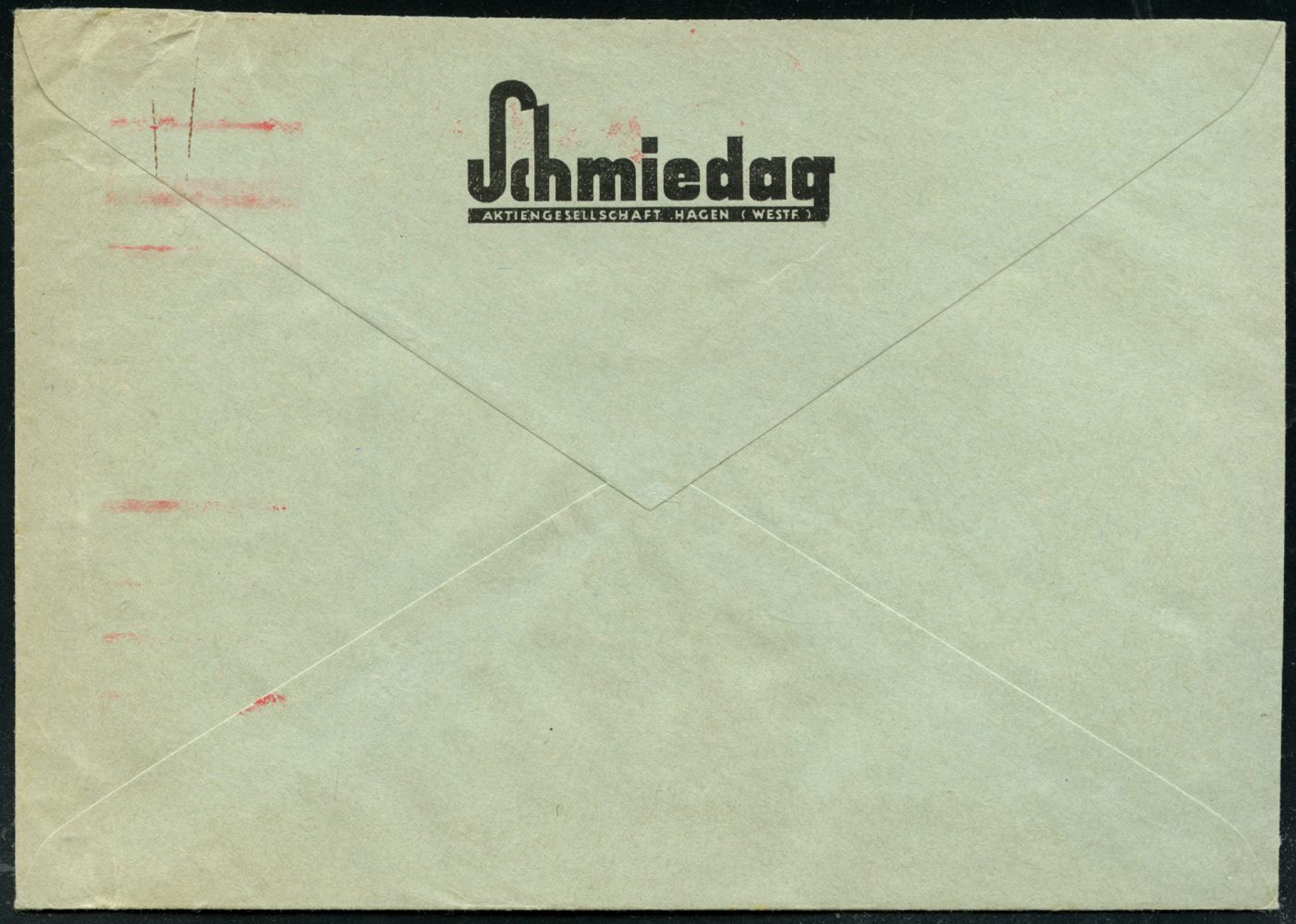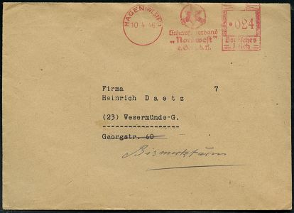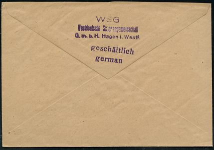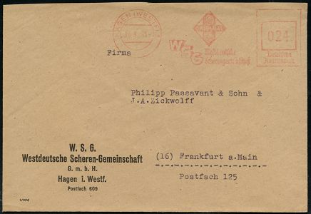 10721 | 25 € | 5800 HAGEN : HAGEN (WESTF) 1/ ORIGINAL/ WSG/ Westdeutsche/ Scherengemeinschaft 1946 (28.3.) aptierter AFS Francotyp "Reichsadler" = entfernt = Notmaßnahme! (Firmen-Logo) Firmen-Fern-Bf., vergl. Kat.-Nr. 10713 (Dü.E-13 J-1290) | ![]() ![]() | |