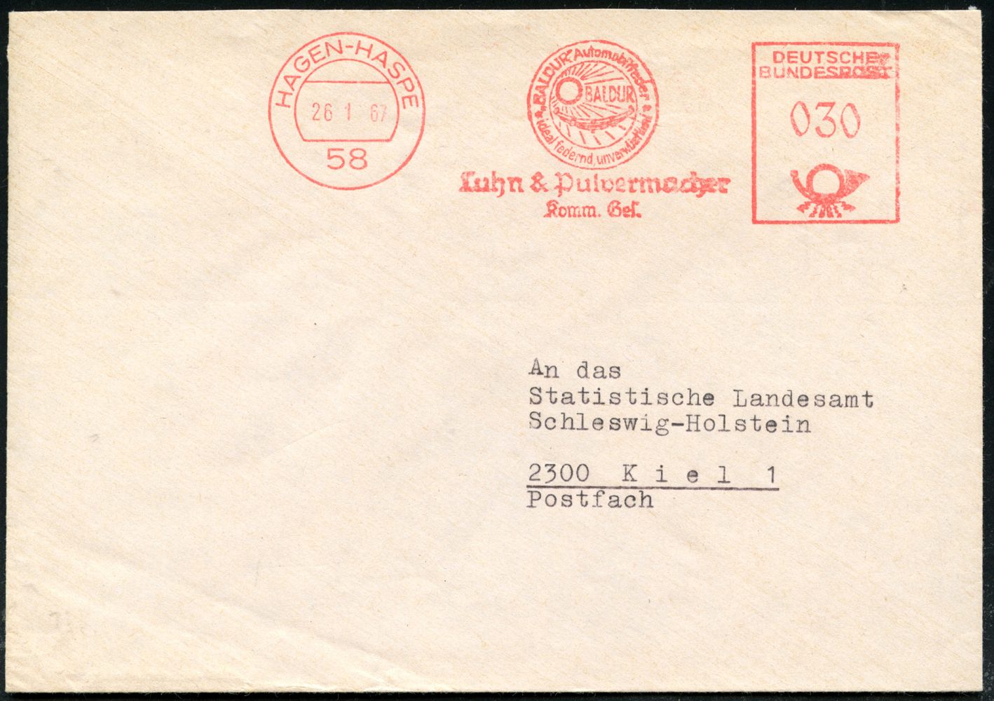 10740 | 15 € | 5800 HAGEN : 58 HAGEN-HASPE/ "BALDUR"-Automobilfeder/ ideal federnd../ Luhn & Pulvermacher/ Kom.Ges. 1967 (26.1.) AFS Francotyp (Firmenlogo: Sonne u. Blatt-Kfz.-Feder) Fern-Bf. (Dü.E-23CEo) | ![]() | |
