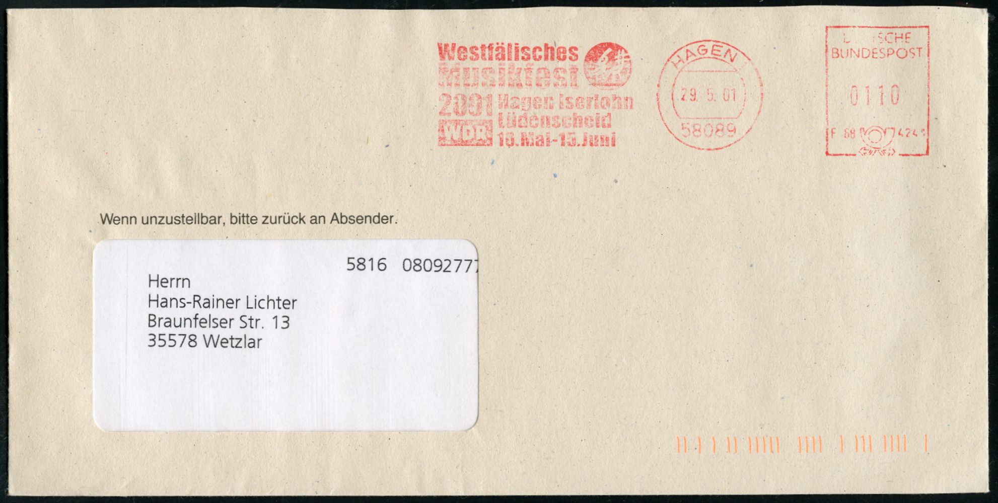 10743 | 10 € | 5800 HAGEN : 58089 HAGEN 1/ F68 4241/ Westfälisches/ Musikfest/ 2001Hagen Iserlohn/ Lüdenscheid/ WDR.. 2001 (29.5.) AFS Postalia (Logo) Fern-Bf. (Dü.E-26, nur kurze Verwendungszeit!) | ![]() | |