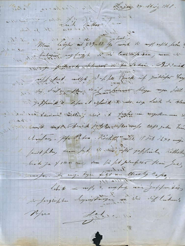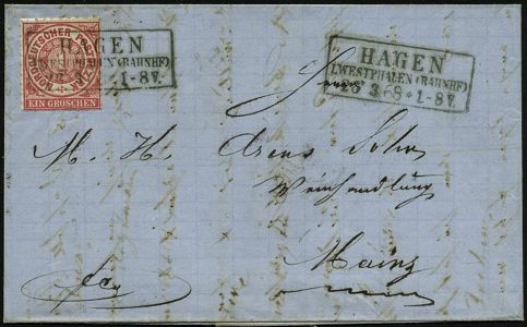 10656 | 25 € | 5800 HAGEN : HAGEN/ I.WESTFALEN (BAHNHF)/ * 1868 (26.3.) nachverwendeter, preuß. Ra.3 (Feuser Nr.1341) 2x klar auf EF 1 Gr. NDP, Fernbf. mit Inhalt mit Blindprägung "Casp. Flüs, Hagen" n. Mainz, rs. AS: D 1 (Mi.4 EF) | ![]() ![]() ![]() | |