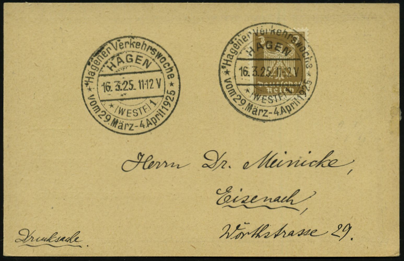 10657 | 20 € | 5800 HAGEN : HAGEN/ *(WESTF)1/ Hagener Verkehrswoche/ vom 29.März-4.April 1925 (16.3.) HWSt , 2x klar gest. Inl.-Karte (Bo.2) | ![]() | |