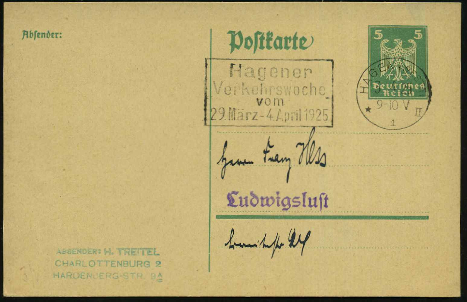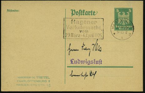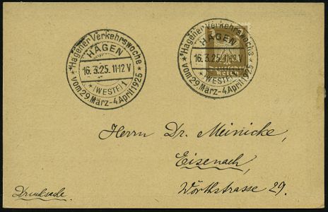 10658 | 18 € | 5800 HAGEN : HAGEN (WESTF)/ *1II/ Hagener/ Verkehrswoche/ vom/ 29.März-4.April 1925 (3.4.) MWSt , klar gest. Inl.-Karte (Bo.3 A) | ![]() | |