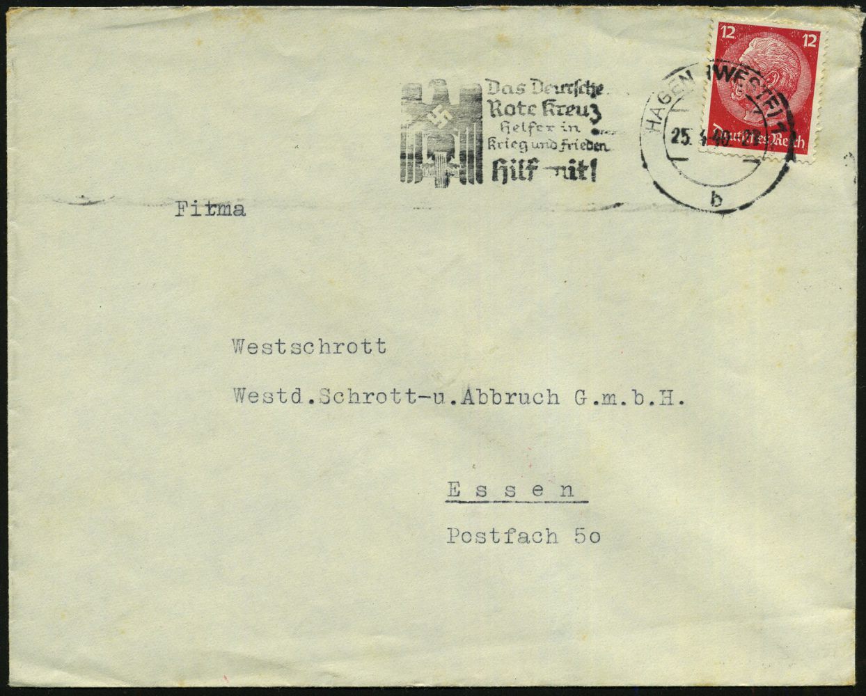 10659 | 18 € | 5800 HAGEN : HAGEN (WESTF) 1/ b/ Das Deutsche/ Rote Kreuz/ Helfer in/ Krieg u.Frieden.. 1940 (25.4.) MWSt (NS-DRK-Adler-Logo) rs. Abs.-Vordruck: STAHLWERKE HARKORT-EICKEN GMBH, Fernbf. an Westschrott, Essen (Bo.S 351 A) | ![]() ![]() | |