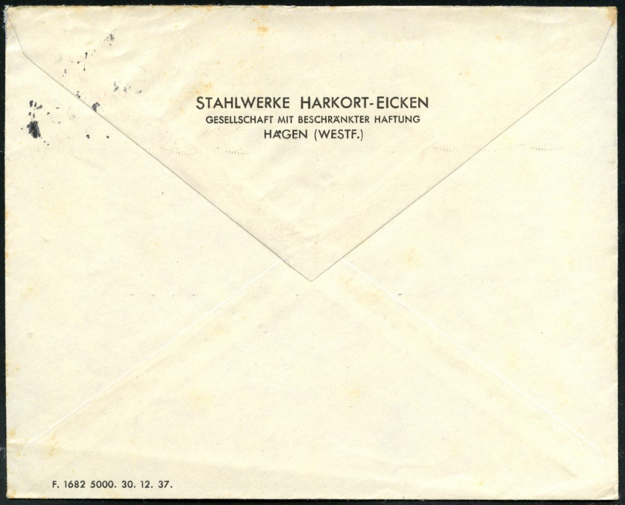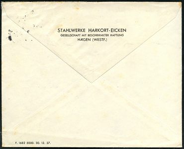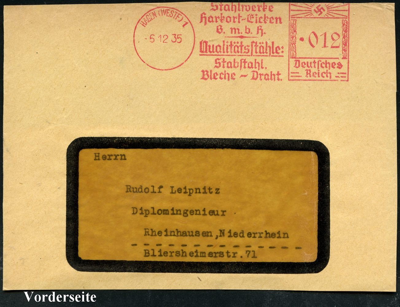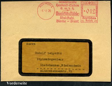 10683 | 18 € | 5800 HAGEN : HAGEN (WESTF) 1/ Stahlwerke/ Harkort-Eicken/ gmbH/ Qualitätsstähle.. 1935 (6.12.) AFS Francotyp "Hakenkreuz" klar auf Bedarfs-Vorderseite = Hersteller von Panzerstahl (Dü.E-3Ao) | ![]() | |