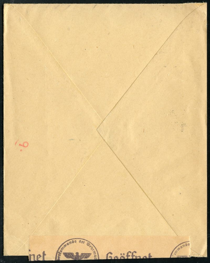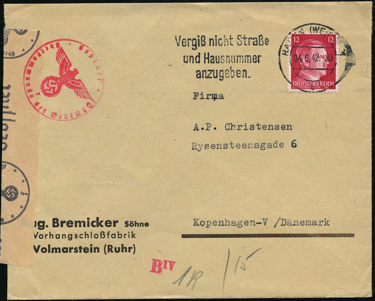 10660 | 20 € | 5800 HAGEN : HAGEN (WESTF)1/ b/ Vergiß nicht Straße/ u.Hausnummer.. 1942 (4.6.) MWSt auf EF 12 Pf. Hitler = Europa-Tarif (Mi.788 EF) + OKW-Zensur-Streifen "f" + roter 1K: "f" (= Hamburg, Rie.F-6, F-51,+ 55 Pkte.) Ausl.-Zensur-Bf. n. Dänemark (Bo.S 72 A) | ![]() ![]() | |