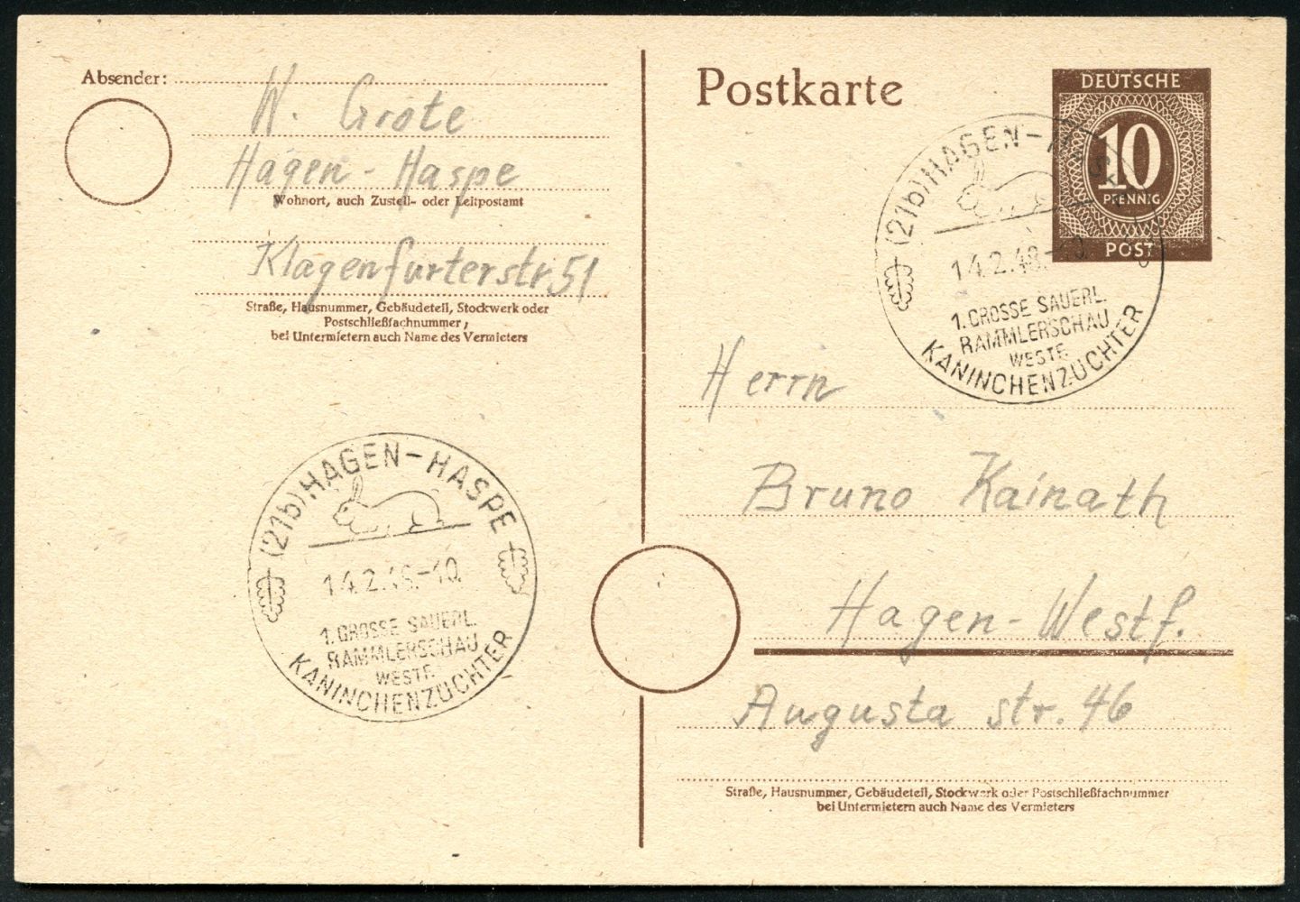 10662 | 16 € | 5800 HAGEN : (21b) HAGEN-HASPE/ 1.GROSSE./ ..RAMMLERSCHAU/ WESTF./ KANINCHENZÜCHTER 1948 (14.2.) SSt = Kaninchen klar auf Orts-P. 10 Pf. Ziffer (Bo.12) | ![]() | |