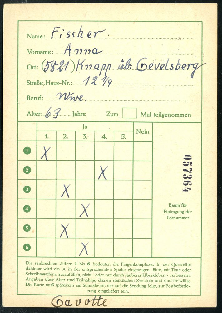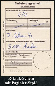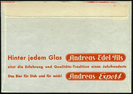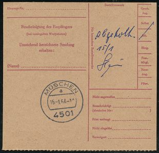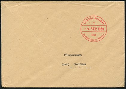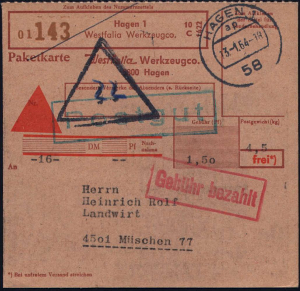 10666 | 14 € | 5800 HAGEN : 58 HAGEN 1/ ap 1964 (13.1.) 1K-Segment + roter Ra.: Gebühr bezahlt (alte Form) Inl.-NN-Selbstbuchr-Postgut-Paketkt.: Westfalia Werkzeug.. n. Müschen, rs. AS. | ![]() ![]() | |