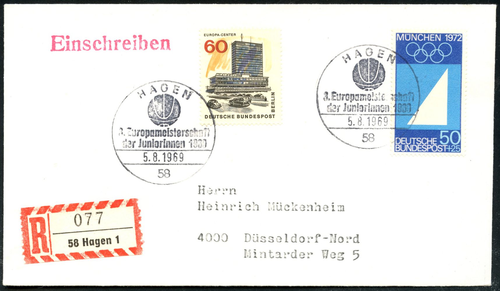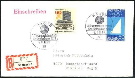 10667 | 16 € | 5800 HAGEN : 58 HAGEN/ 3.Europameisterschaft/ d.Junioren 1969 (5.8.) SSt (Basketball) auf 50 + 25 Pf. Olympiade 1972 u.a., + RZ: 58 Hagen 1, klar gest. Inl.-R-Bf. (Bo.24) | ![]() | |