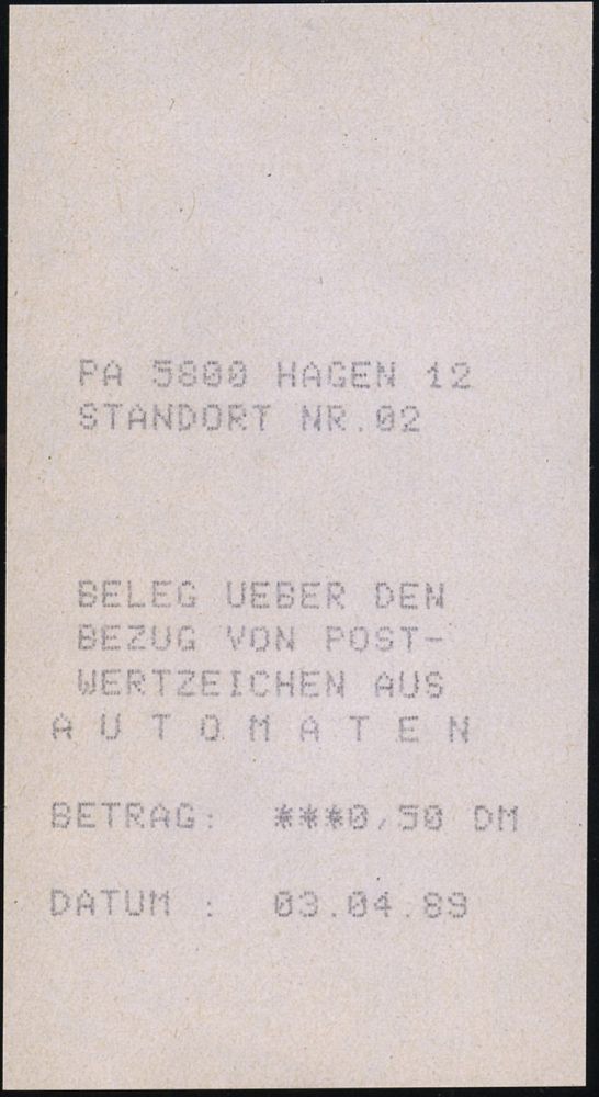 10668 | 18 € | 5800 HAGEN : 5800 HAGEN 12/ aa 1989 (3.4.) 1K-Segment 2x auf ATM 50 Pf. u. 300 Pf. + RZ: 5800 Hagen 12/d + 2 Automaten-Quittungen, weiße Matrix-Codierung, klar gest. Inl.-R-Bf. + R-Einl.-Schein, 4 Belege kompl. (Mi.1-1) | ![]() ![]() ![]() ![]() | |