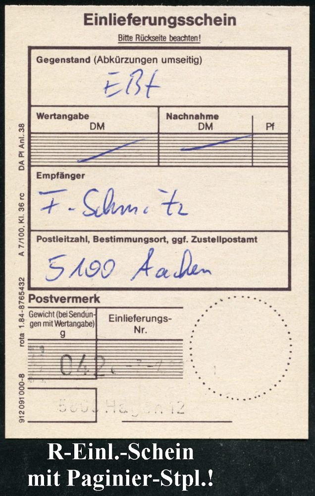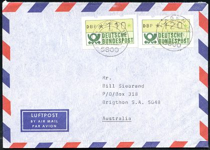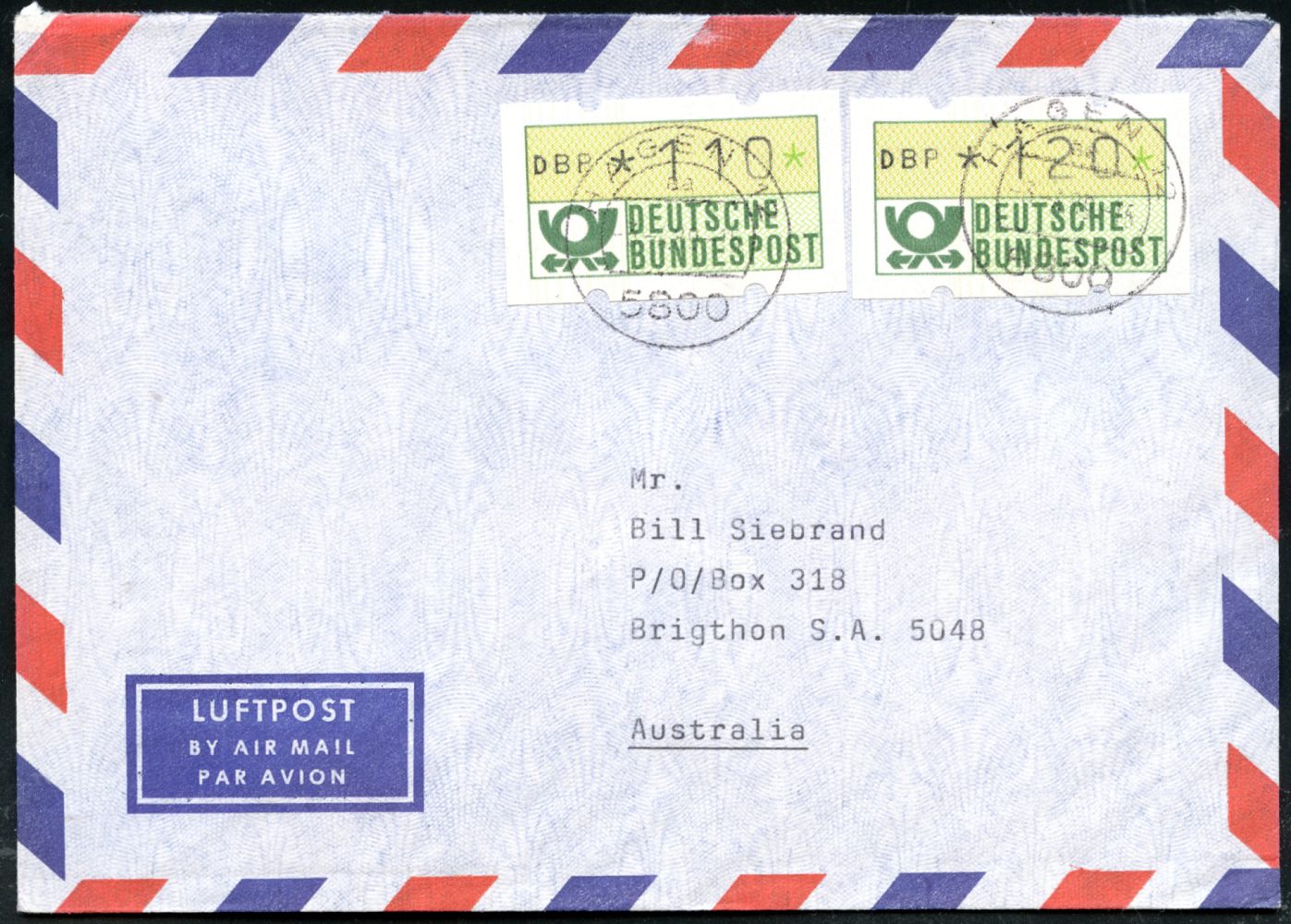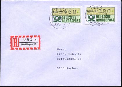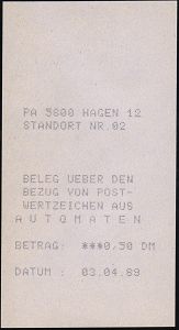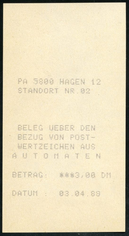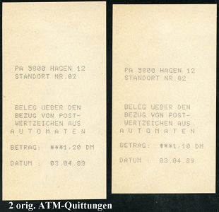 10669 | 18 € | 5800 HAGEN : 5800 HAGEN 12/ aa 1989 (3.4.) 1K-Segment 2x auf ATM 110 Pf. u. 120 Pf. = 230 Pf. + 2 ATM-Quittungen , portorichtiger Übersee-Flp.-Bf. n. Australien!, 3 Belege kompl.! (Mi.1) | ![]() ![]() | |