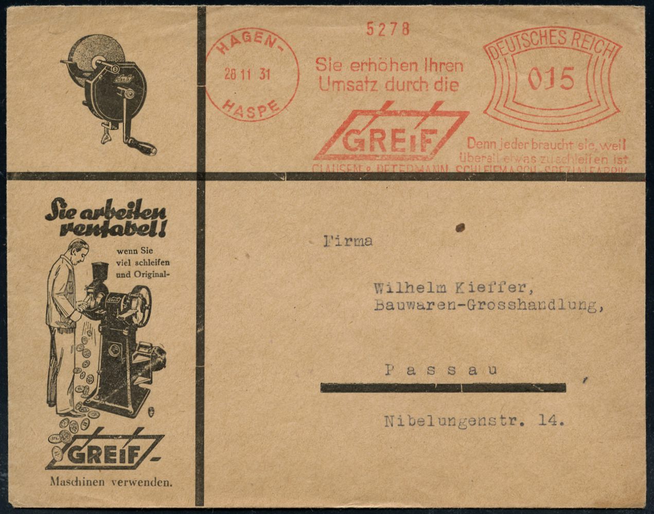 10675 | 28 € | 5800 HAGEN : HAGEN-/ HASPE/ Sie erhöhen Ihren/ Umsatz durch die/ GREIF/ CLAUSSEN & DETERMANN SCHLEIFMASCH.-SPEZIALFABRIK 1931 (20.11.) AFS Francotyp "Bogenrechteck" auf Reklame-Bf.: Sie arbeiten rentabel!.. GREIF-Maschinen verwenden. (Hand- u. Elektro- Schleifmaschine), dekorativer Fern-Bf. (Dü.E-1CEh) | ![]() | |