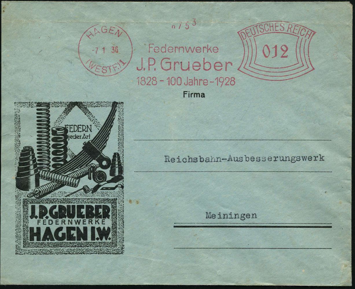 10684 | 20 € | 5800 HAGEN : HAGEN/ (WESTF.)1/ Federnwerke/ J.P.Grueber/ 1828-100 Jahre-1928 1936 (7.1.) seltener Jubil.-AFS Francotyp "Bogenrechteck" auf dekorativer Reklame-Bf.: FEDERN jeder Art.. (oben schwache Querfalte) klar gest.! (Dü.E-1CEh) | ![]() | |