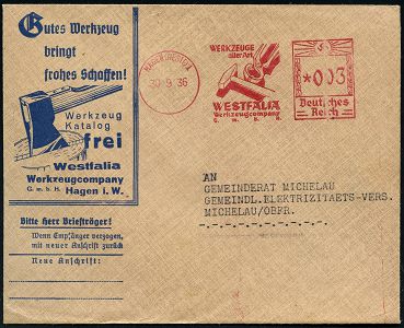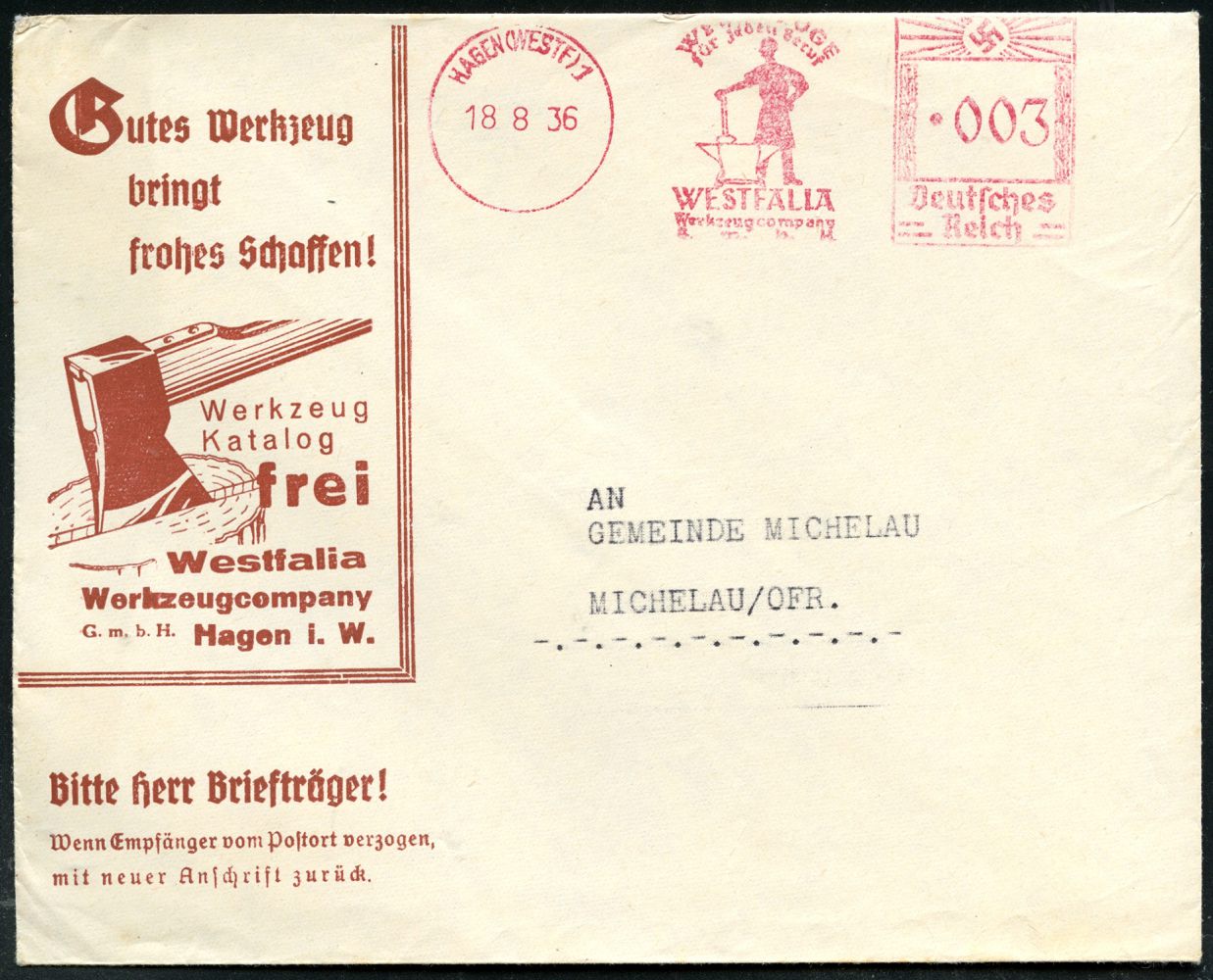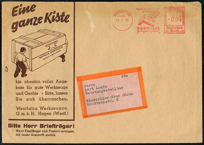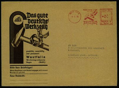10705 | 18 € | 5800 HAGEN : HAGEN (WESTF)1/ ..WESTFALIA/ Werkzeugcompany/ GmbH 1938 (13.1.) AFS Francotyp "Hakenkreuz"(Motive: = Hammer u. Beißzange) , großer Reklame-Bf.: Eine ganze Kiste WESTFALIA WERKZEUG.. (Format A5, oben Bräunung) Inl.-Drs.-Bf. (Dü.E-1Ao) | ![]() | |