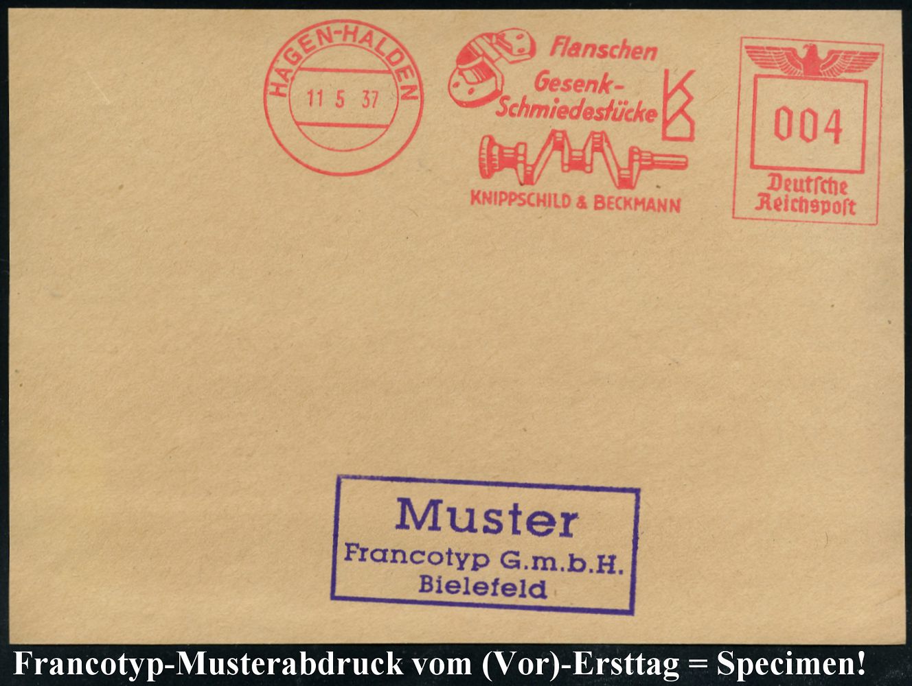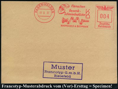 10695 | 35 € | 5800 HAGEN : HAGEN-HALDEN/ Flanschen/ Sesenk-/ Schmiedestücke/ KNIPPSCHILD & BECKMANN 1937 (11.5.) AFS-Musterabdruck Francotyp "Reichsadler" (Schmiede-Teile) glasklar gest. Francotyp-Musterblatt vom (Vor)-Ersttag!, selten! (Dü.E-5CGo) | ![]() ![]() | |