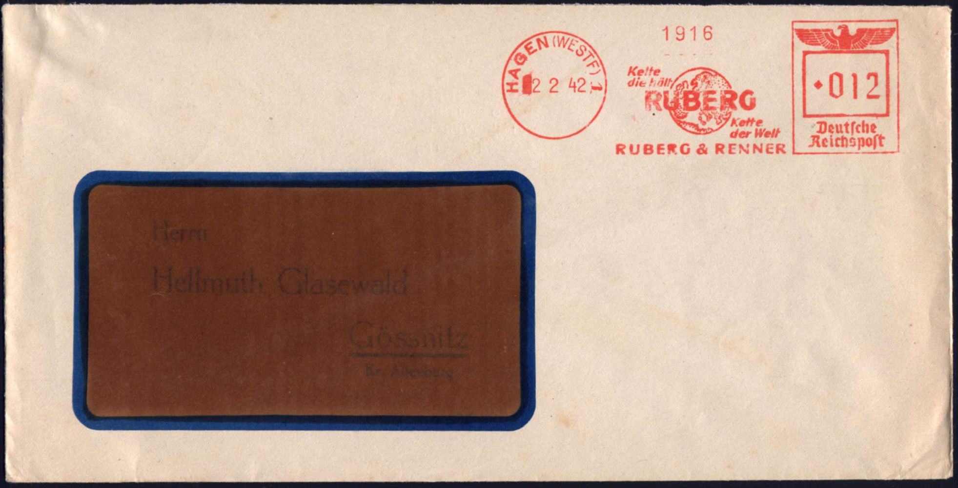 10717 | 18 € | 5800 HAGEN : HAGEN (WESTF)1/ Kette/ die hält../ RUBERG & RENNER 1942 (19.11.) dekorativer AFS Francotyp "Reichsadler" (Globus) klar gest. Fernbf. (kl. Randrißchen) rs. Abs.-Vordruck (Dü.E-5DGh) | ![]() | |