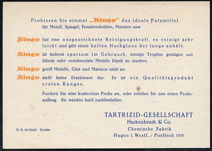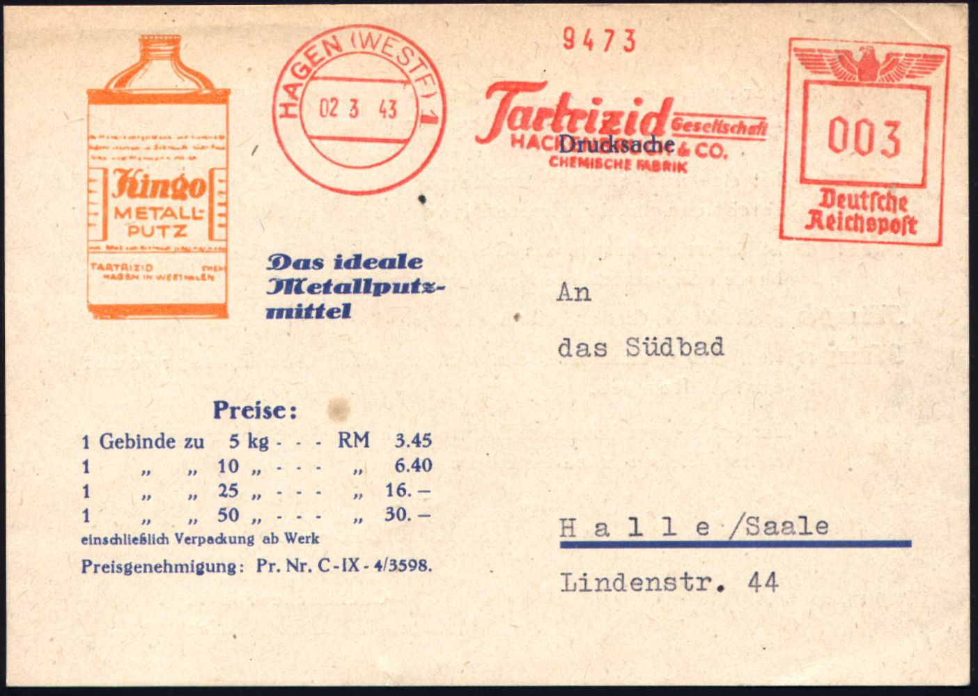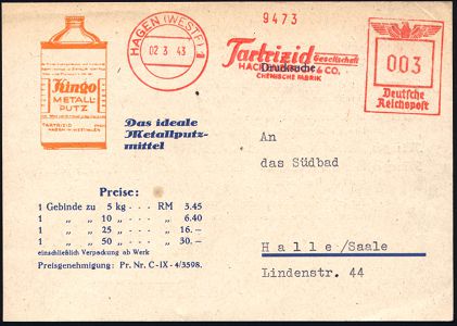 10718 | 22 € | 5800 HAGEN : HAGEN (WESTF)1/ Tartrizid Ges./ HACKENBRUCH & CO/ CHEMISCHE FABRIK 1943 (2.3.) AFS Francotyp "Reichsadler" klar auf dekorativer, zweifarbiger Reklame-Kt.: Kingo Metallputz (Dü.E-5CGh) | ![]() ![]() | |
