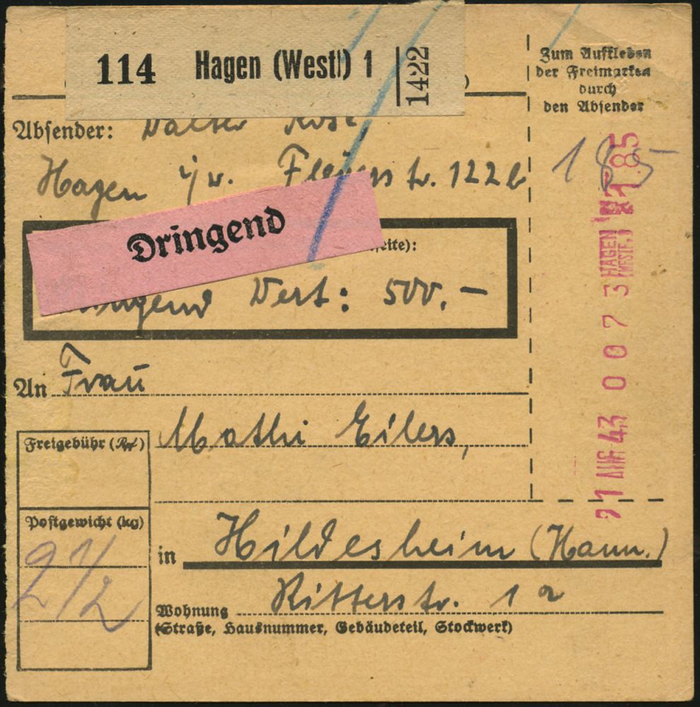10719 | 20 € | 5800 HAGEN : HAGEN/ (WESTF.) 1943 (21.8.) Anker-Registrierkassen-Paket-FS *1.85 RM + NS-Prägeadler horizontal + schw. Paketzettel: Hagen (Westf) 1 + rosa Aufkleber: Dringend, Inl.-Eil-Paketkt. n. Hildesheim (Dü.H-1A/2) | ![]() | |