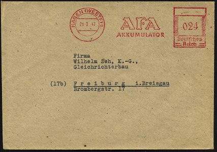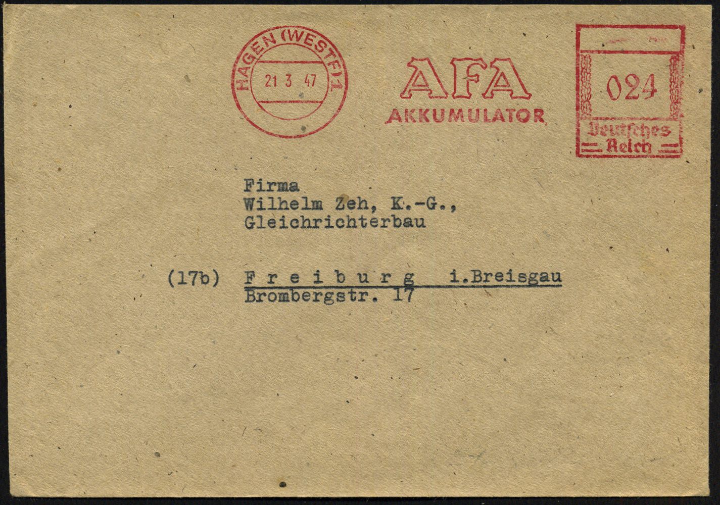 10726 | 25 € | 5800 HAGEN : HAGEN (WESTF)1/ AFA/ AKKUMULATOR 1947 (21.3.) seltener, aptierter AFS Francotyp "Hakenkreuz" = entfernt = Notmaßnahme! , rs. Abs.-3L: Accumulatoren Fabrik AG.., Fernbf. n. Freiburg/Br. (Dü.E-12 K-98o) | ![]() | |
