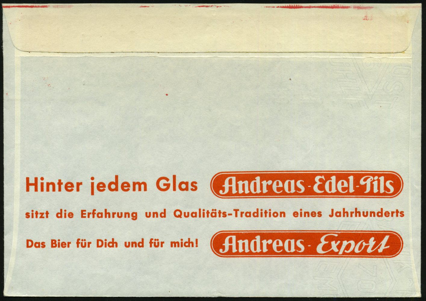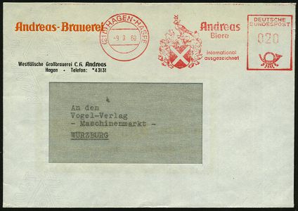 10737 | 18 € | 5800 HAGEN : (21b) HAGEN-HASPE/ Andreas/ Biere.. 1960 (9.9.) AFS Francotyp = Wappen mit Jagdfalken , zweifarbiger Reklame-Bf., rs. Text, Fernbf., seltenes Motiv! (Dü.E-20CG) | ![]() ![]() | |