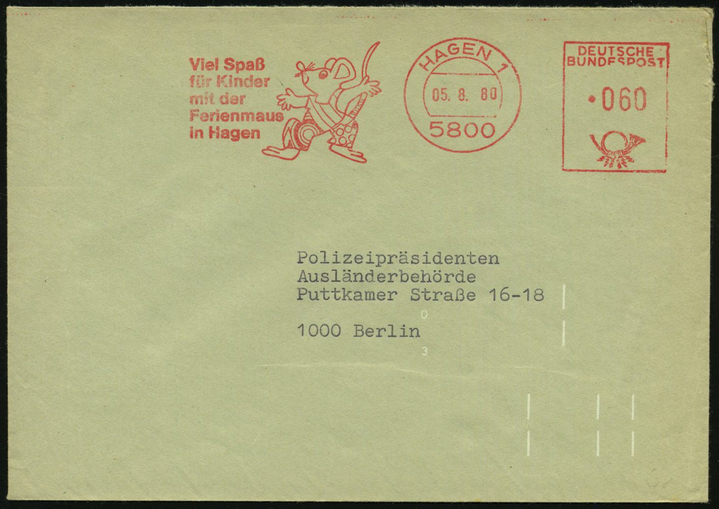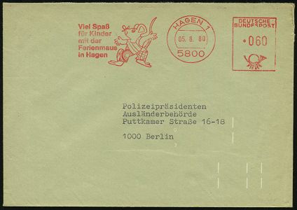 10741 | 14 € | 5800 HAGEN : 5800 HAGEN 1/ Viel Spaß/ für Kinder/ mit d./ Ferienmaus.. 1980 (5.8.) AFS Francotyp = Maus , klar gest. Kommunalbf. mit weißer Matrix-Codierung (AEG-Telefunken) n. West-Berlin (Dü.E-26) | ![]() | |