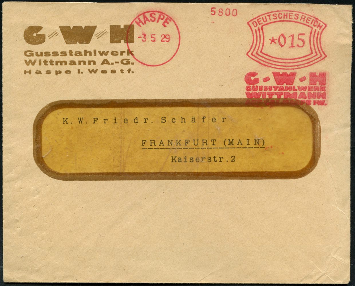 10670 | 25 € | 5800 HAGEN : Hagen-Haspe 1929 (3.5.) AFS Francotyp "Bogenrechteck": HASPE/ G - W -H/GUSSSTAHLWERKE/ WITTMANN.. (Monogr.) motivgl. Firmen-Fern-Bf. (Dü.E-1Ah) | ![]() | |