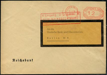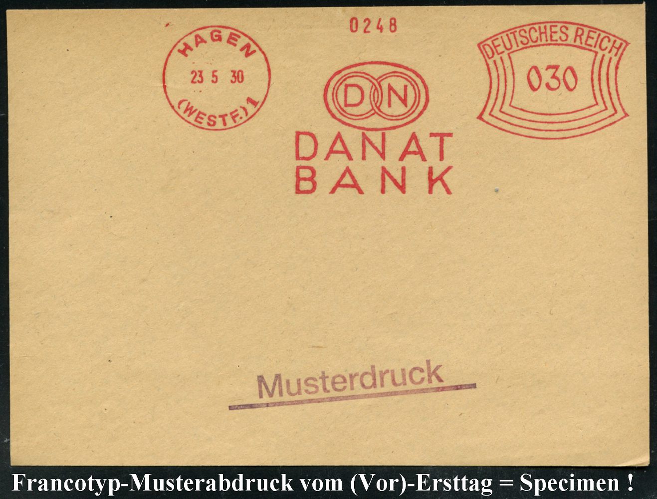 10672 | 35 € | 5800 HAGEN : HAGEN/ (WESTF.) 1/ DN/ DANAT/ BANK 1930 (23.5.) AFS-Musterabdruck Francotyp "Bogenrechteck" (Monogr.-Logo) = DA(MSTÄDTER & NAT(IONALBANK) die Bank ging nach der Weltwirtschaftskrise (1931) in Konkurs, Übernahme durch die Dresdner Bank, glasklar gest. glasklare Francotyp-Musterblatt vom (Vor)-Ersttag !, selten! (Dü.E-1CEh) | ![]() ![]() | |