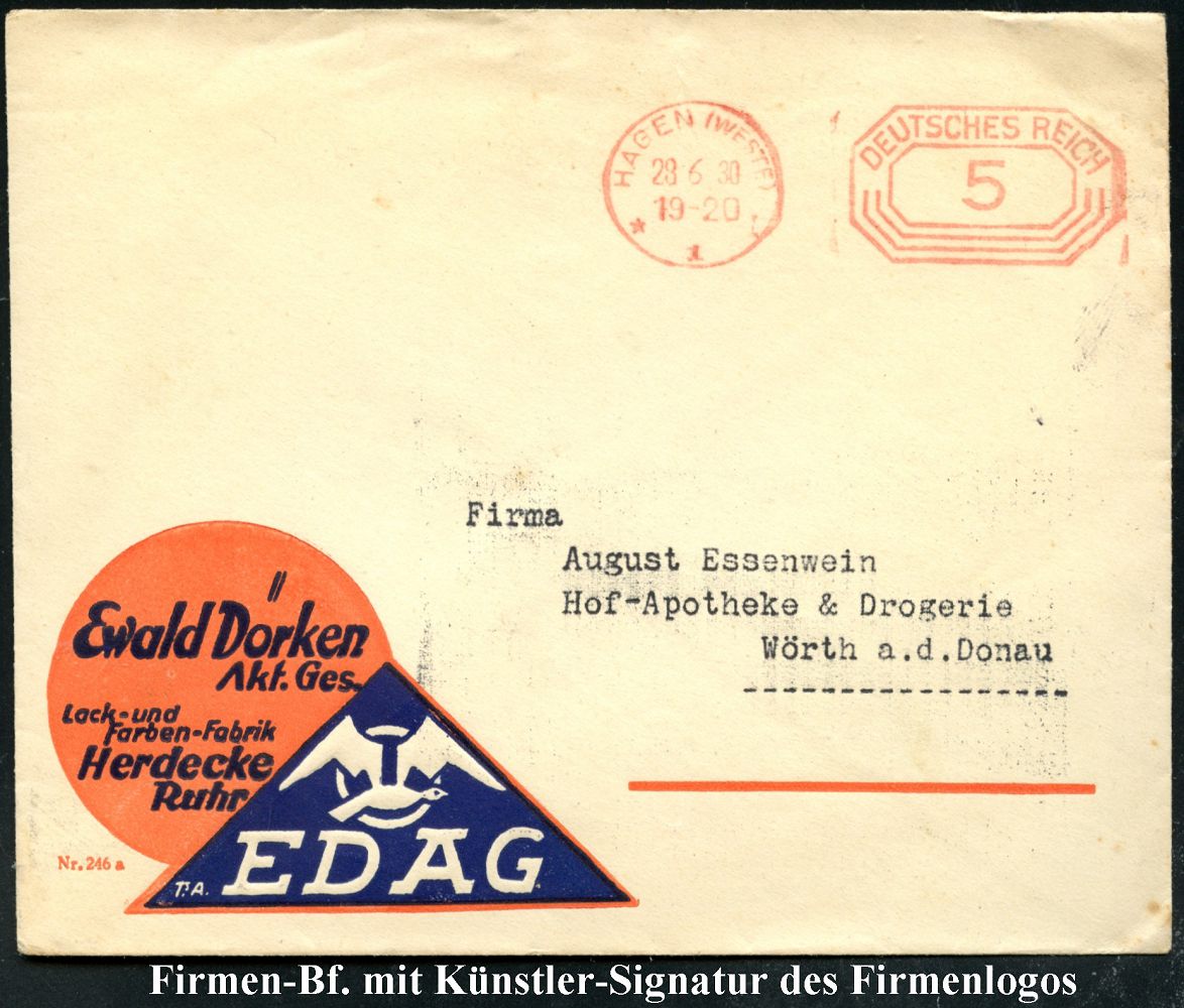 10674 | 18 € | 5800 HAGEN : HAGEN (WESTF)/ * 1 I/ DEUTSCHES REICH 1930 (28.6.) PFS "Achteck" 5 (Pf.) auf zweifarbigem Firmen-Bf.: Ewald Dörken Akt. Ges., Lack- u. Farbenfabrik, Herdecke.. EDAG mit (Firmen-Logo + Künstlersignatur (Ts. A.), (Dü.D-4) | ![]() | |