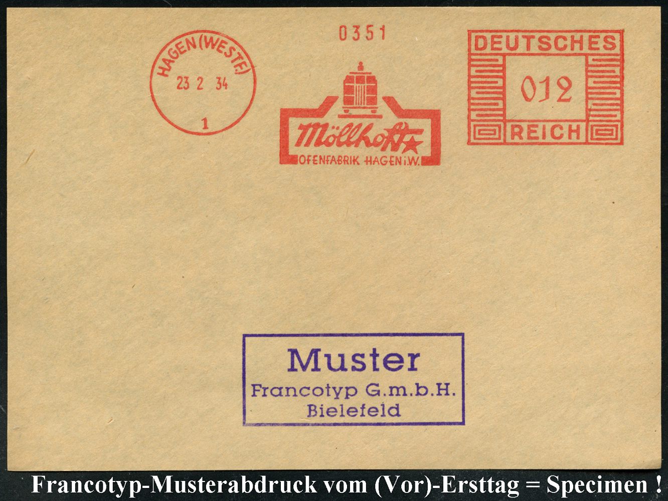 10678 | 35 € | 5800 HAGEN : HAGEN (WESTF.)/ 1/ Möllhoft/ OFENFABRIK.. 1934 (23.2.) AFS-Musterabdruck Francotyp "Mäanderrechteck" (Ofen) glasklar gest. Francotyp-Musterblatt vom (Vor)-Ersttag !, selten! (Dü.E-2CEh) | ![]() ![]() | |