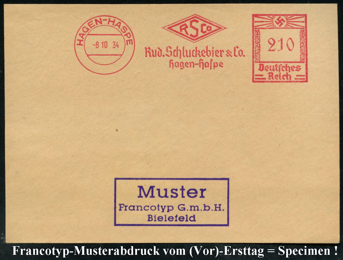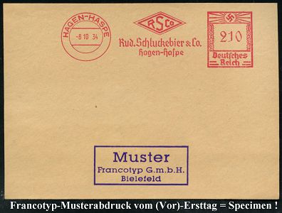 10680 | 35 € | 5800 HAGEN : HAGEN-HASPE/ RS Co/ Rud.Schluckebier & Co... 1934 (8.10.) AFS-Musterabdruck Francotyp "Hakenkreuz" (Firmenlogo) glasklar gest. Francotyp-Musterblatt vom (Vor)-Ersttag !, selten! (Dü.E-3CE) | ![]() ![]() | |