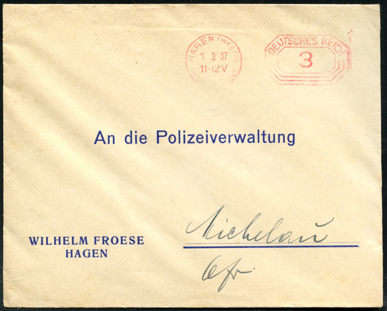 10689 | 15 € | 5800 HAGEN : HAGEN (WESTF.)/ * 1 II/ DEUTSCHES REICH 1937 (1.3.) PFS "Achteck" 3 (Pf.) , Firmen-Bf.: WILHELM FROESE.. mit Vordruck: An die Polizeiverwaltung (Dü.D-4) | ![]() | |