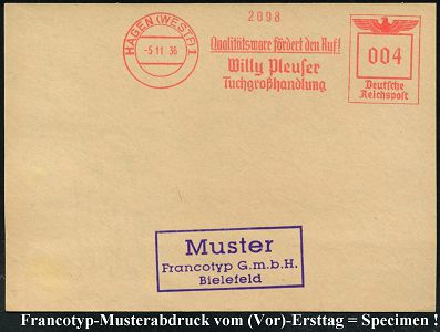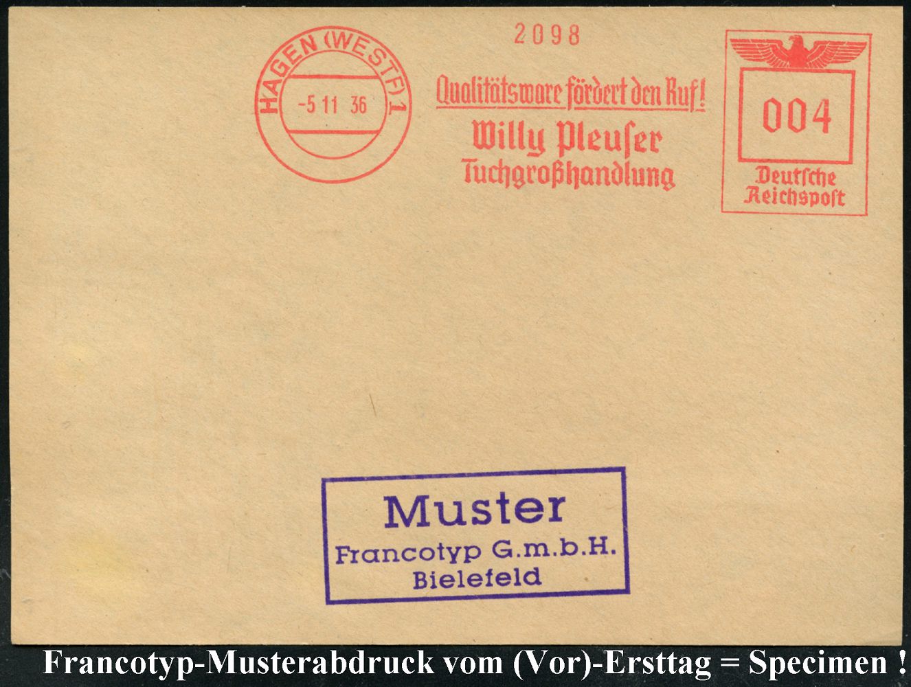 10690 | 35 € | 5800 HAGEN : HAGEN (WESTF) 1/ Qualitätsware fördert den Ruf!/ Willy Pleuser/ Tuchgroßhandlung 1936 (5.11.) AFS-Musterabdruck Francotyp "Reichsadler" , glasklar gest. Francotyp-Musterblatt vom (Vor)-Ersttag !, selten! (Dü.E-5CGh) | ![]() ![]() | |