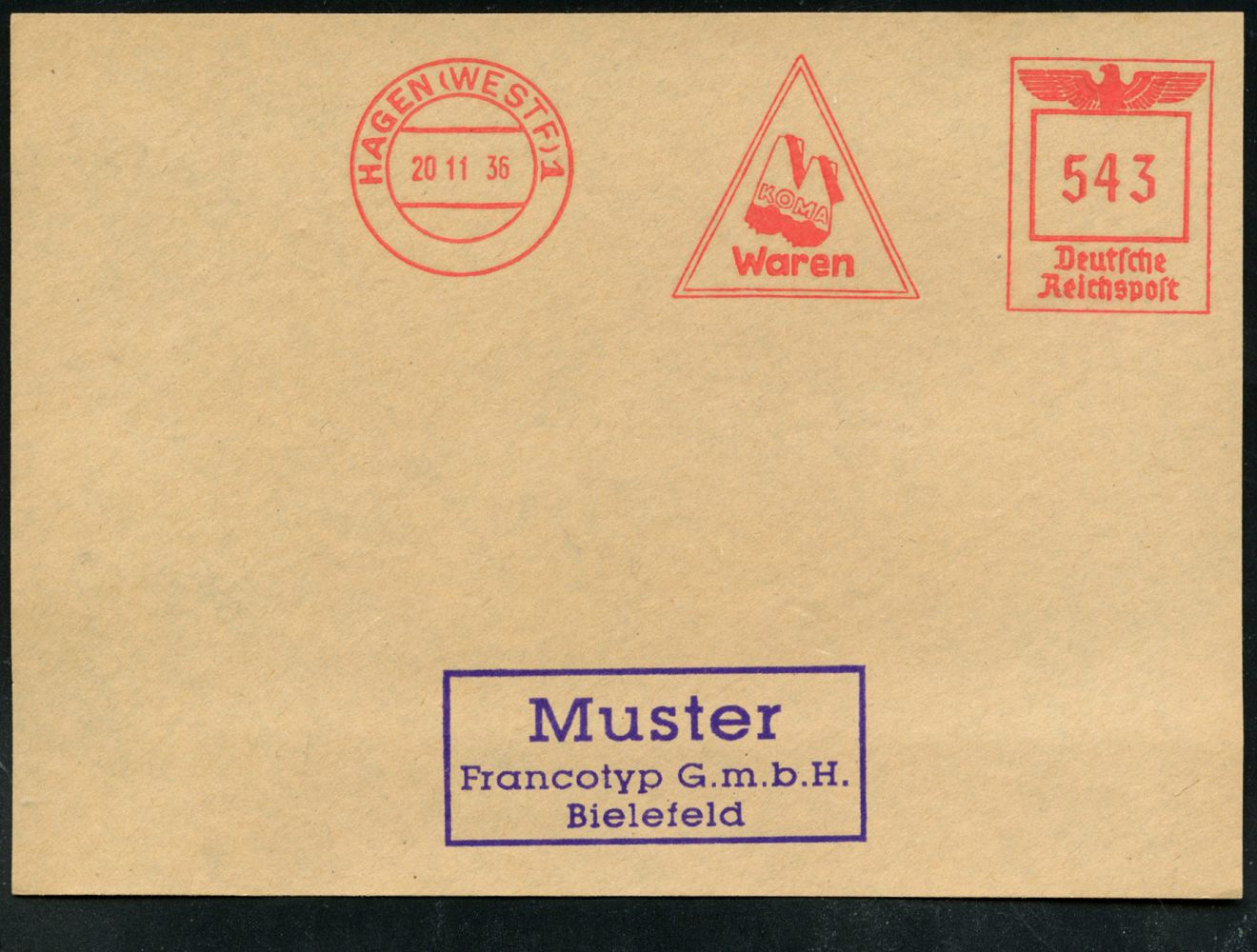 10691 | 35 € | 5800 HAGEN : HAGEN (WESTF) 1/ KOMA/ Waren 1936 (20.11.) AFS-Musterabdruck Francotyp "Reichsadler" (Firmen-Logo) glasklar gest. Francotyp-Musterblatt vom (Vor)-Ersttag !, selten! (Dü.E-5CGo) | ![]() ![]() | |