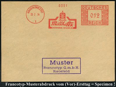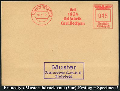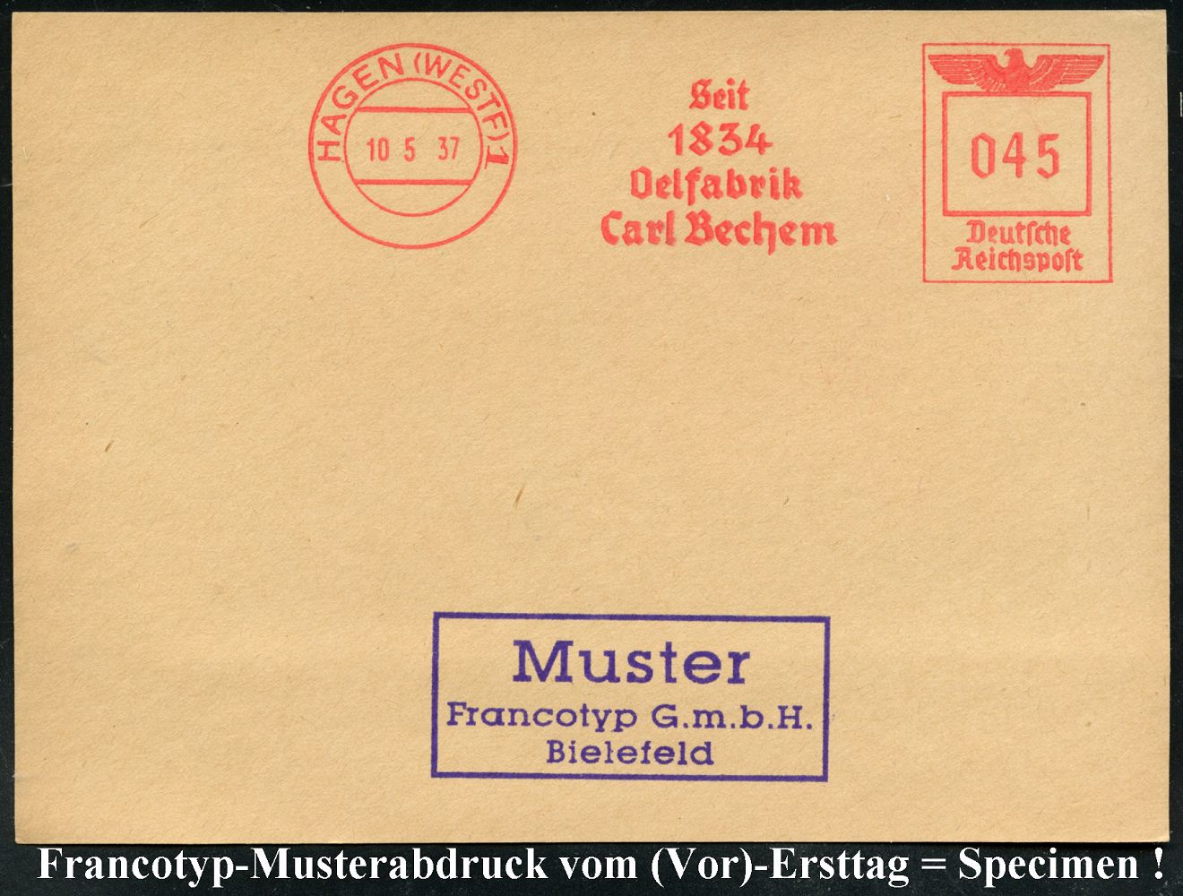 10694 | 35 € | 5800 HAGEN : HAGEN (WESTF) 1/ Seit/ 1834/ Oelfabrik/ Carl Bechem 1937 (10.5.) AFS-Musterabdruck Francotyp "Reichsadler" , glasklar gest. Francotyp-Musterblatt vom (Vor)-Ersttag !, selten! (Dü.E-5CGo) | ![]() ![]() | |