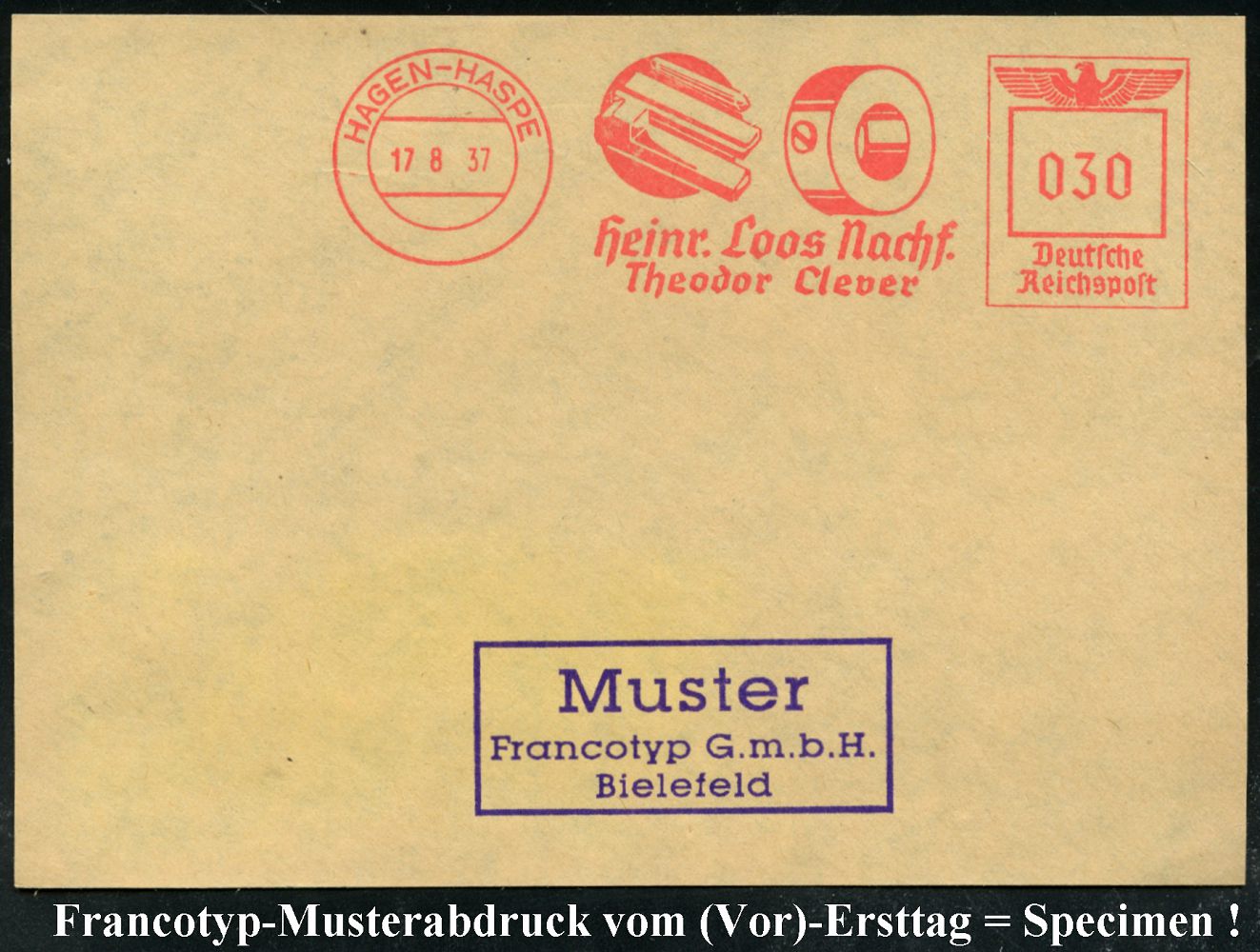 10699 | 35 € | 5800 HAGEN : HAGEN-HASPE/ Heinr.Loos Nachf./ Theodor Clever 1937 (17.8.) AFS-Musterabdruck Francotyp "Reichsadler" (2 Stahlteile) glasklar gest. Francotyp-Musterblatt vom (Vor)-Ersttag !, selten! (Dü.E-5CGo) | ![]() ![]() | |