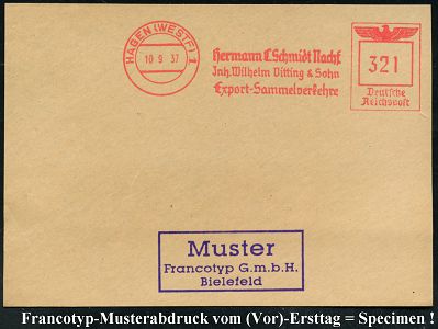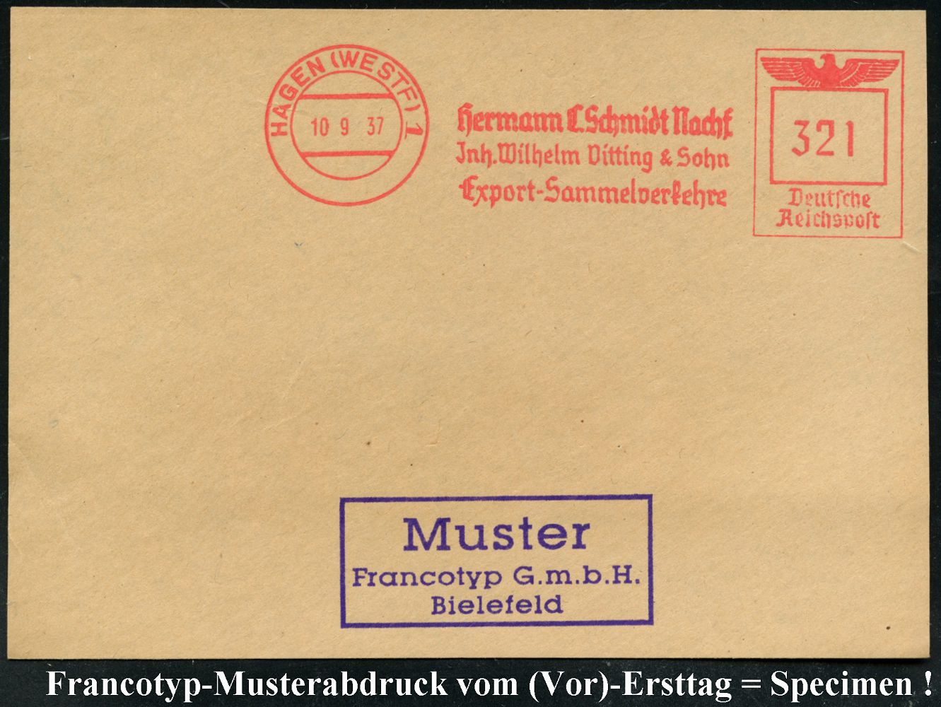 10700 | 35 € | 5800 HAGEN : HAGEN (WESTF) 1/ Hermann C.Schmidt Nachf./ Jnh. Wilhelm Vitting & Sohn/ Export-Sammelverkehr 1937 (10.9.) AFS-Musterabdruck Francotyp "Reichsadler" , glasklar gest. Francotyp-Musterblatt vom (Vor)-Ersttag !, selten! (Dü.E-5CGo) | ![]() ![]() | |