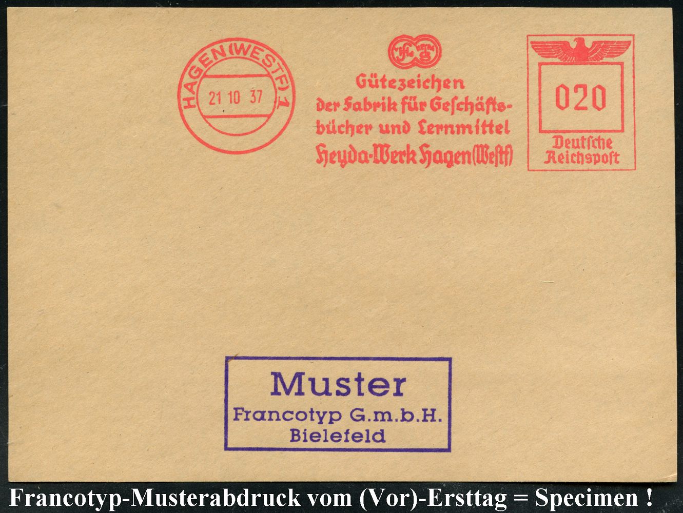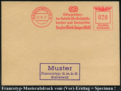 10701 | 35 € | 5800 HAGEN : HAGEN (WESTF) 1/ Gütezeichen/ der Fabrik für Geschäfts-/ bücher u.Lernmittel/ Heyda-Werk.. 1937 (21.10.) AFS-Musterabdruck Francotyp "Reichsadler" (Firmen-Logo) glasklar gest. Francotyp-Musterblatt vom (Vor)-Ersttag !, selten! (Dü.E-5CGo) | ![]() ![]() | |