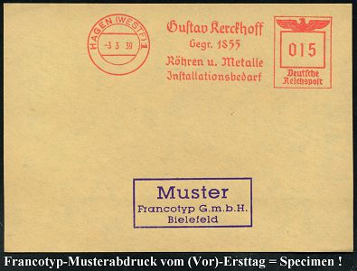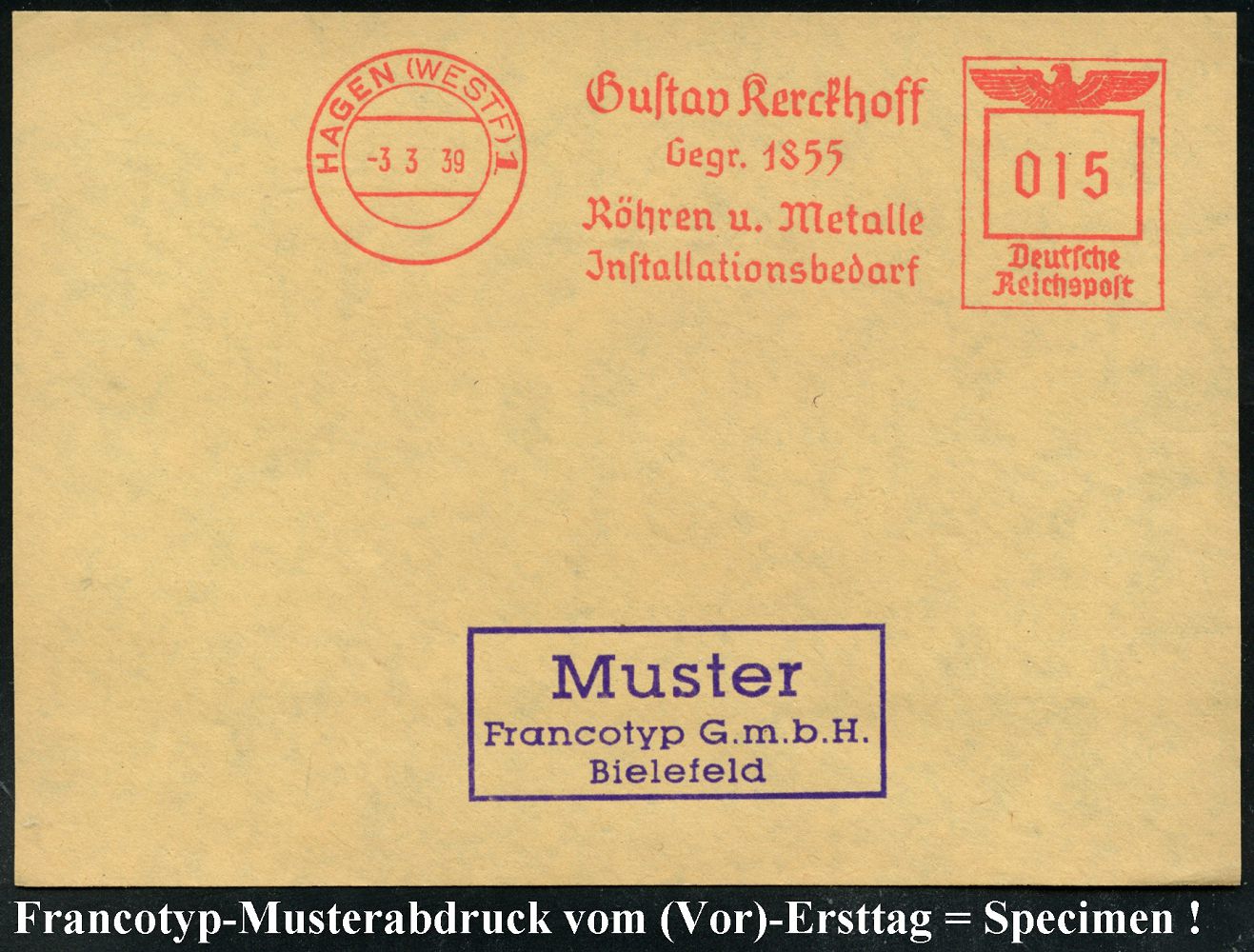 10712 | 35 € | 5800 HAGEN : HAGEN (WESTF) 1/ Gustav Kerckhoff/ Gegr.1855/ Röhren u.Metalle/ Jnstallationsbedarf 1939 (3.3.) AFS-Musterabdruck Francotyp "Reichsadler" , glasklar gest. Francotyp-Musterblatt vom (Vor)-Ersttag !, selten! (Dü.E-5CGo) | ![]() ![]() | |