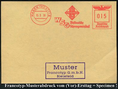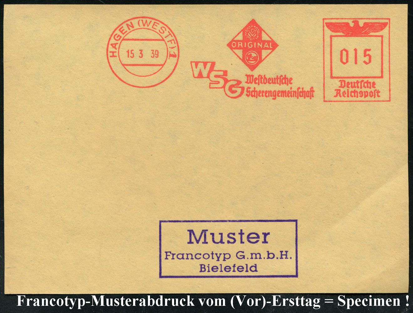 10713 | 35 € | 5800 HAGEN : HAGEN (WESTF) 1/ ORIGINAL/ WSG/ Westdeutsche/ Scherengemeinschaft 1939 (15.3.) AFS-Musterabdruck Francotyp "Reichsadler" (Firmen-Logo) glasklar gest. Francotyp-Musterblatt vom (Vor)-Ersttag !, selten! (Dü.E-5CGo) | ![]() ![]() | |