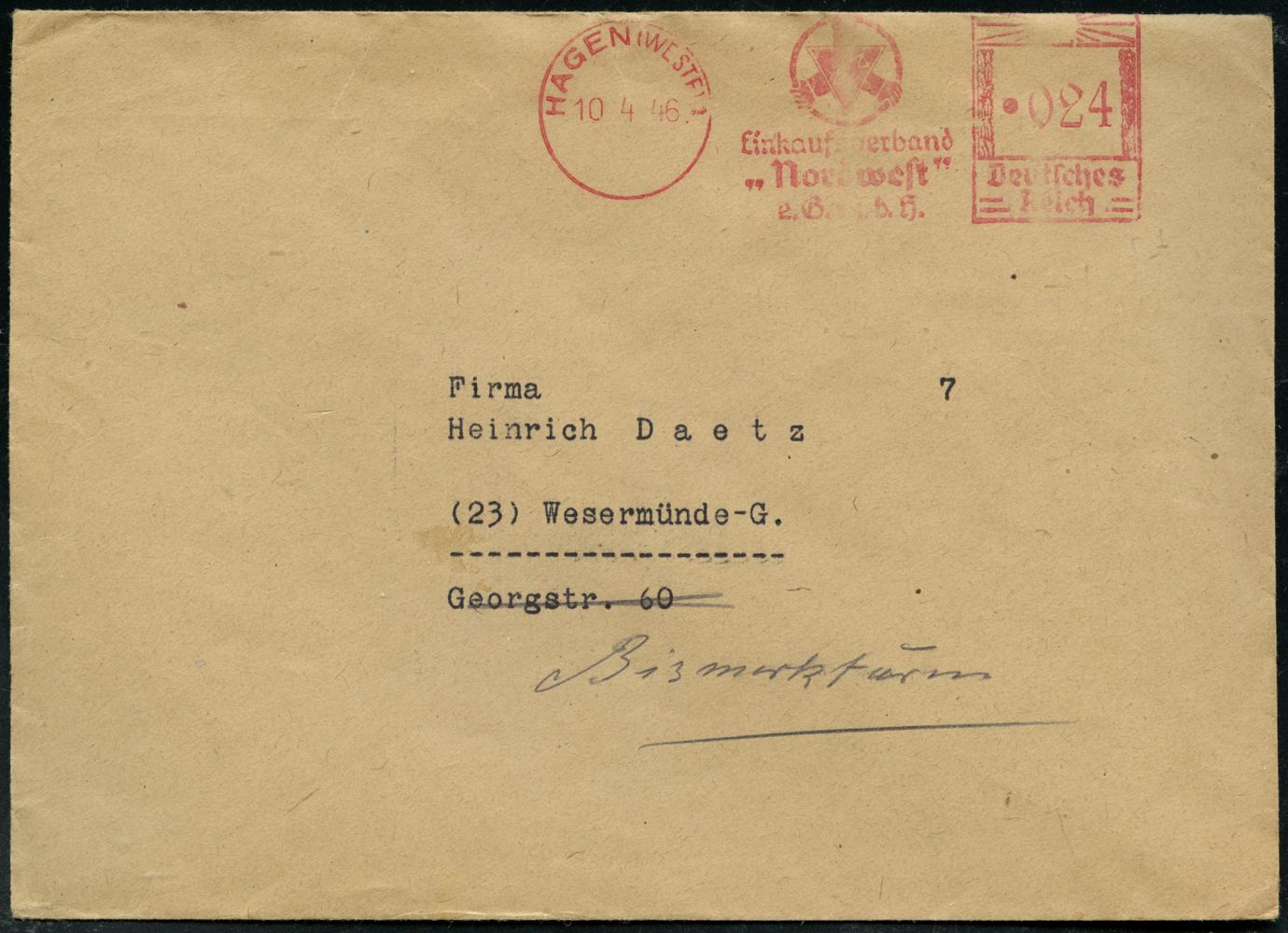 10722 | 30 € | 5800 HAGEN : HAGEN (WESTF) 1/ Einkaufsverband/ "Nordwest"/ e.G.m.b.H. 1946 (10.4.) aptierter AFS Francotyp "Hakenkreuz" = entfernt = Notmaßnahme! (Monogr.-Logo) seltener Fern-Bf. (Dü.E-12 D-86o mit Punkt = seltene Type!) | ![]() | |