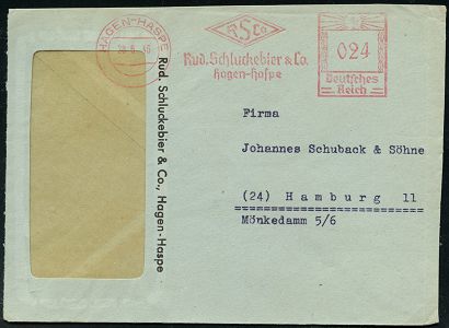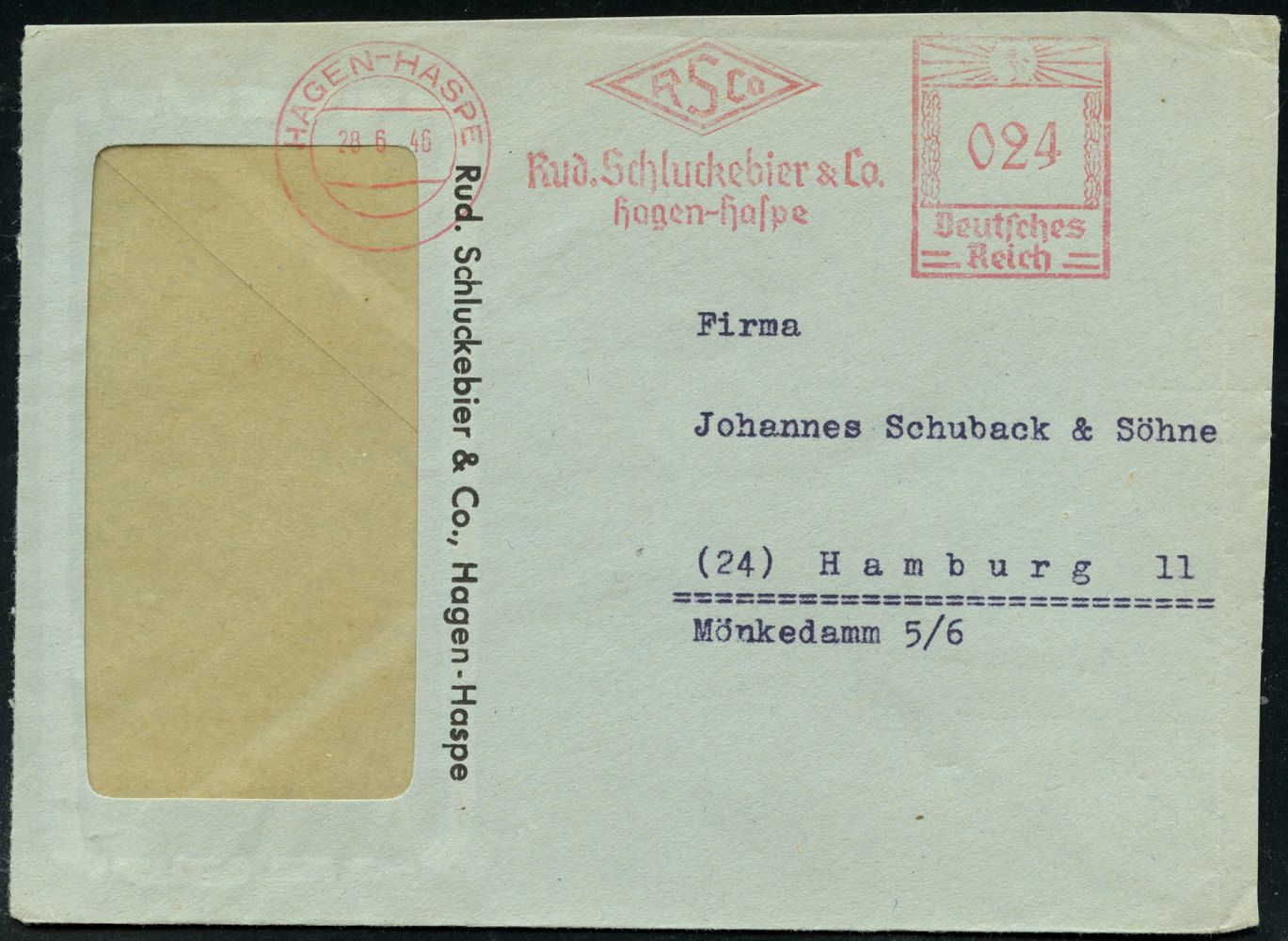 10724 | 30 € | 5800 HAGEN : HAGEN-HASPE/ RS Co/ Rud.Schluckebier & Co.. 1946 (28.6.) seltener, aptierter AFS Francotyp "Hakenkreuz" = entfernt = Notmaßnahme! (Monogr.-Logo) Firmen-Fern-Bf. n. Hambg., vergl. Kat.-Nr. 10680 (Dü.E-12 D-98o) | ![]() | |