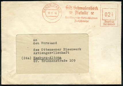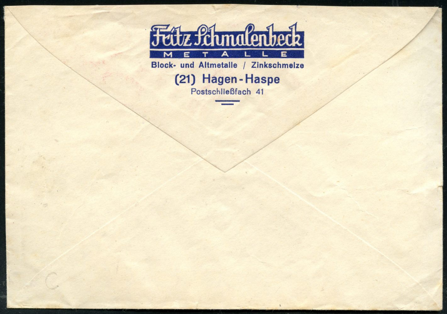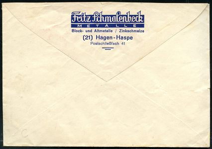10727 | 25 € | 5800 HAGEN : HAGEN-HASPE/ Fritz Schmalenbeck/ Metalle/ Roh-Altmetalle-Metallrückstände/ Zinkschmelze 1946 (15.11.) aptierterter AFS Francotyp "Reichsadler" = entfernt = Notmaßnahme! (Bergbau-Hämmer) rs. Abs.-Vordruck, Fern-Bf. (Dü.E-13 J-129o) | ![]() ![]() | |