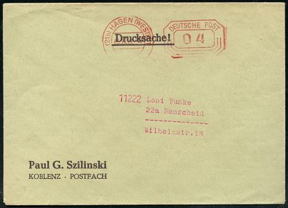 10732 | 12 € | 5800 HAGEN : (21a) HAGEN (WESTF) 1/ DEUTSCHE POST 1950 (5.10.) PFS "Achteck" 04 (Pf.) auf Firmen-Bf.: Paul G. Szilinski, Koblenz.. (Dü.D-11, Nr.260) | ![]() | |