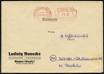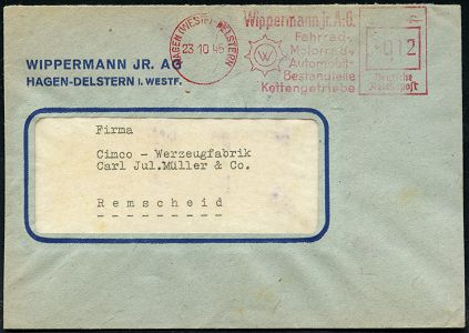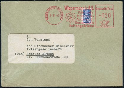 10731 | 16 € | 5800 HAGEN : HAGEN (WESTF)-DELSTERN/ Wippermann jr.AG/ Fahrrad-/ Motorrad-/ ..Kettengetriebe 1949 (9.8.) AFS Francotyp "Posthorn" (Zahnkranz-Logo) auf 2 Pf. NoB (= Vorausentwertung) rs. Abs.-Vordruck, Fern-Bf. (Dü.E-20DG) | ![]() | |